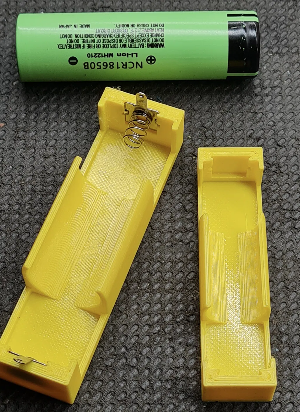 Mình có đặt mấy cái kẹp pin từ aliexpress về (link bên dưới nè), xài khá ổn mà rẻ nữa, nên mình làm mấy cái đế pin cho nó. Mình nghĩ mấy cái tiếp xúc này xài được với dòng 1-2A ít nhất. Với mấy cục pin 18650 trơn, không có mấu ở cực dương như trên hình, thì bạn thêm tí hàn chì lên trên cái tiếp điểm để nó nhô lên tí nha. File source Freecad cũng có đính kèm theo đó.