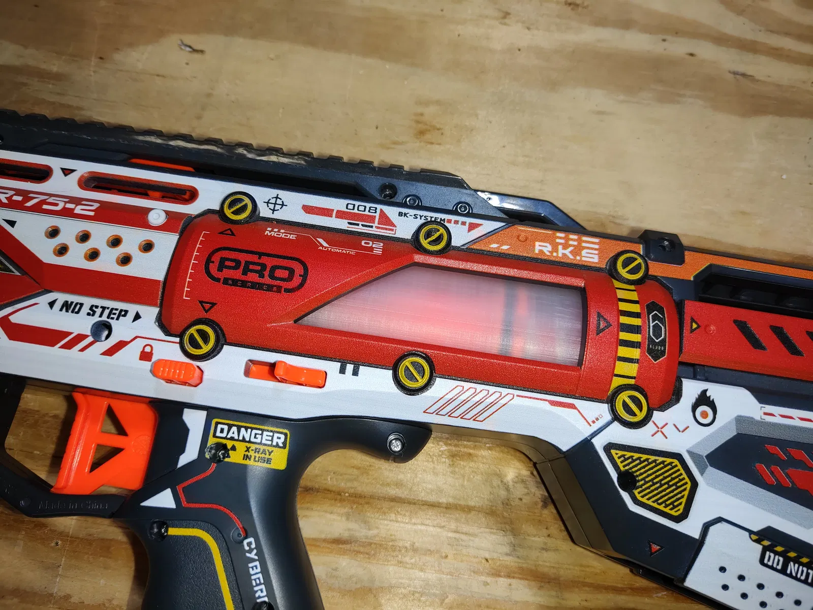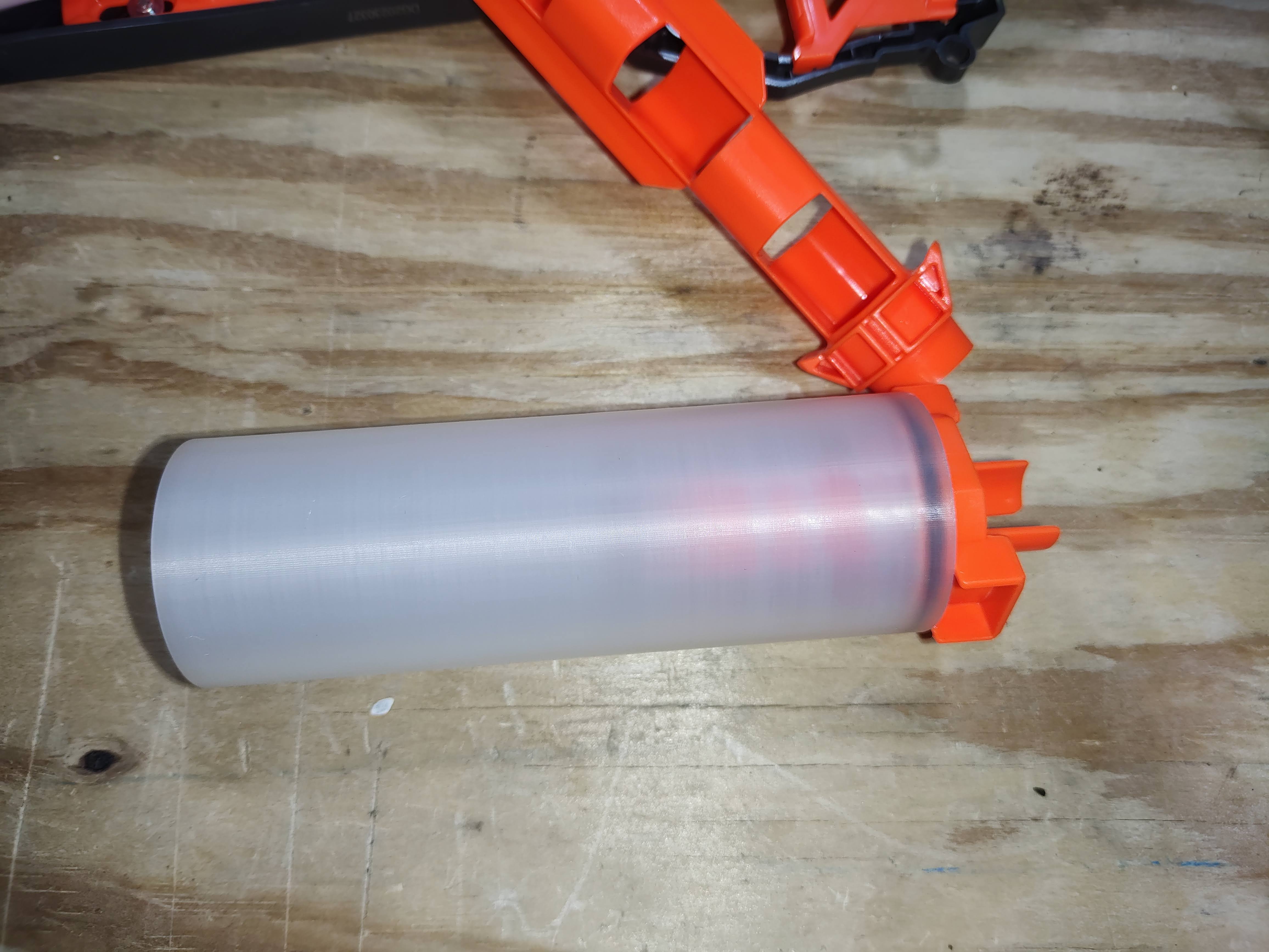Ống lót piston thay thế in 3D cho Zuru X-Shot Longshot. Kích thước ống nhỏ hơn zin một chút, thành ống dày 1.8mm. Nên bôi mỡ hoặc chà nhám lòng ống để hoạt động trơn tru hơn.