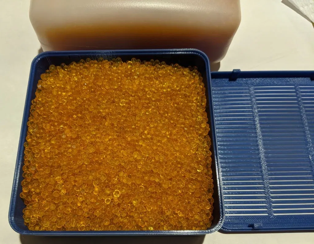 Hộp đựng chất hút ẩm đơn giản, khớp gài chắc chắn. Bản V3 có khớp gài cải tiến nhưng khó tháo rời. Khuyến nghị in bằng PETG, lưu ý đến khả năng bám dính của vật liệu. Dung sai khớp nắp là 0.5mm, chứa khoảng 1/3 quart chất hút ẩm.