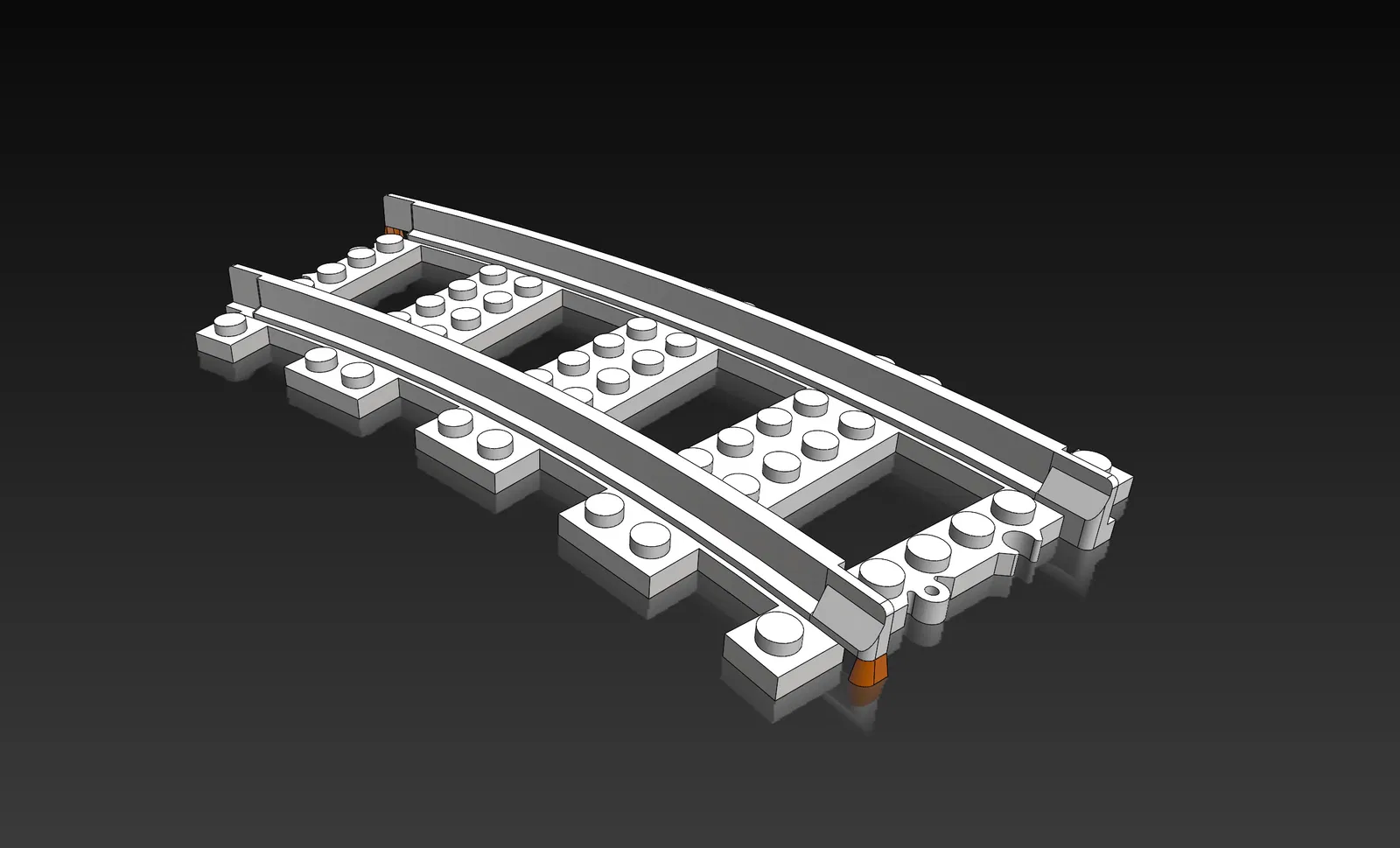 Phần đáy của đường ray được thiết kế để bạn có thể gắn các viên gạch LEGO® vào, nhưng vẫn dễ in (các lỗ nhỏ ở đáy của viên gạch LEGO® chính hãng gần như không thể in 3D một cách đáng tin cậy). Điều này cho phép bạn xây dựng đường ray cao và cầu cùng với các khối lego.