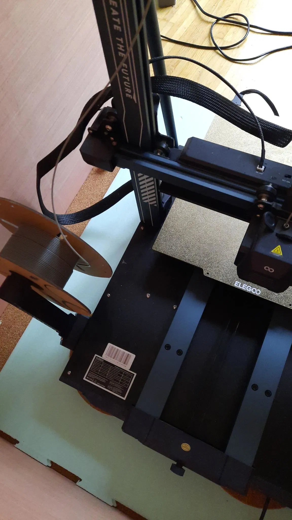 Mục đích chính là tiết kiệm không gian hơn một chút ở đây, mà không có nguy cơ va chạm với bàn in hoặc gây ma sát cho đường đi của sợi nhựa. Vì vậy, một kẹp đơn giản gắn sang bên cạnh có phần nhô ra trên máy in được lắp đặt để nằm ngoài bàn in cho bán kính cuộn dây lên tới 90 mm.
