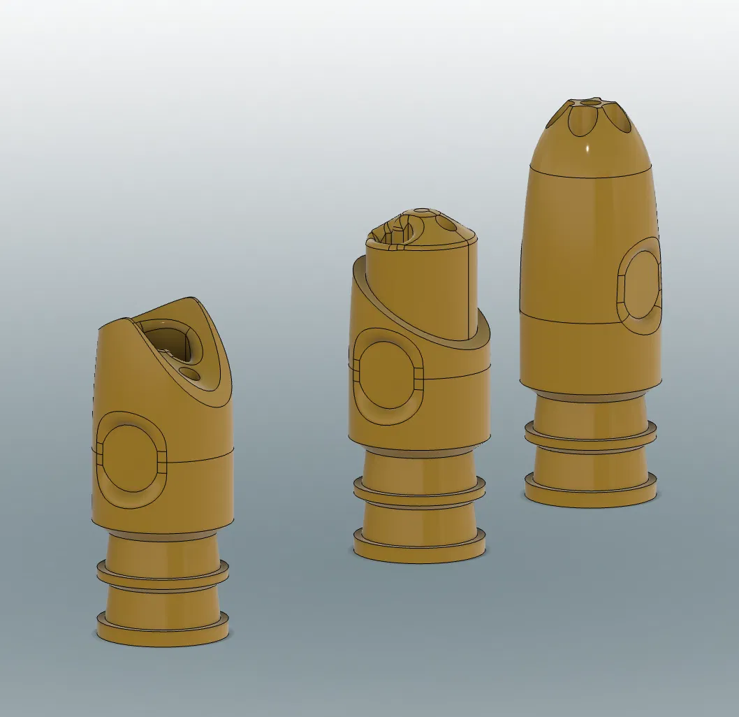 Cái này xài chân váy bằng cao su cho mực nha. Thiết kế dựa trên mấy cái bằng kim loại mua trên Aliexpress đó. Có 3 phiên bản, thiết kế dạng nghiêng hoặc dạng đầu đạn. In không cần support. Đã thử nghiệm sơ sơ rồi.