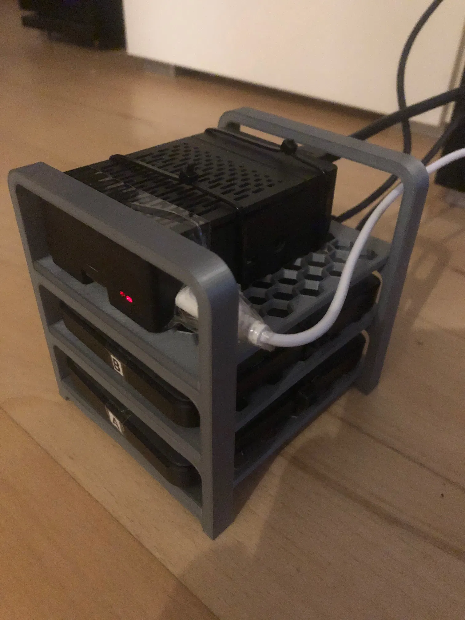 Cái kệ này được làm ra để kết hợp Raspberry Pi 4 với vỏ case có quạt tản nhiệt và hai ổ cứng ngoài 2.5 inch thành một thiết bị NAS tự chế chạy OpenMediaVault. Bộ chia USB cần thiết không nằm trong bộ phận này, tôi để nó ở chỗ khác.