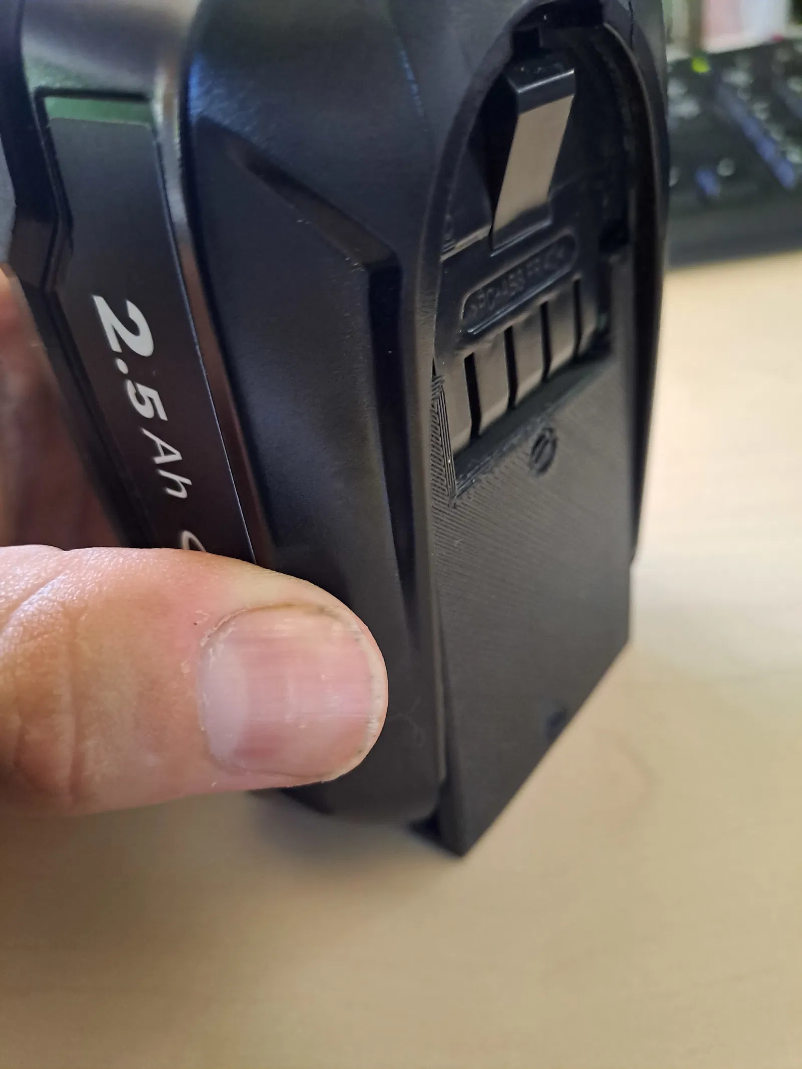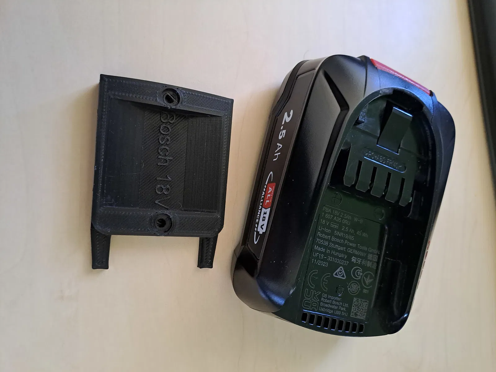 Đây là giá đỡ pin Bosch 18V All-in-One, thuộc hệ thống “Bosch alliance”. Giá đỡ này có thể gặp lỗi khi cắt lớp nhưng vẫn in được. Lưu ý, thiết kế không gắn trực tiếp lên tường và chỉ dùng ở vị trí dọc nha bạn.
