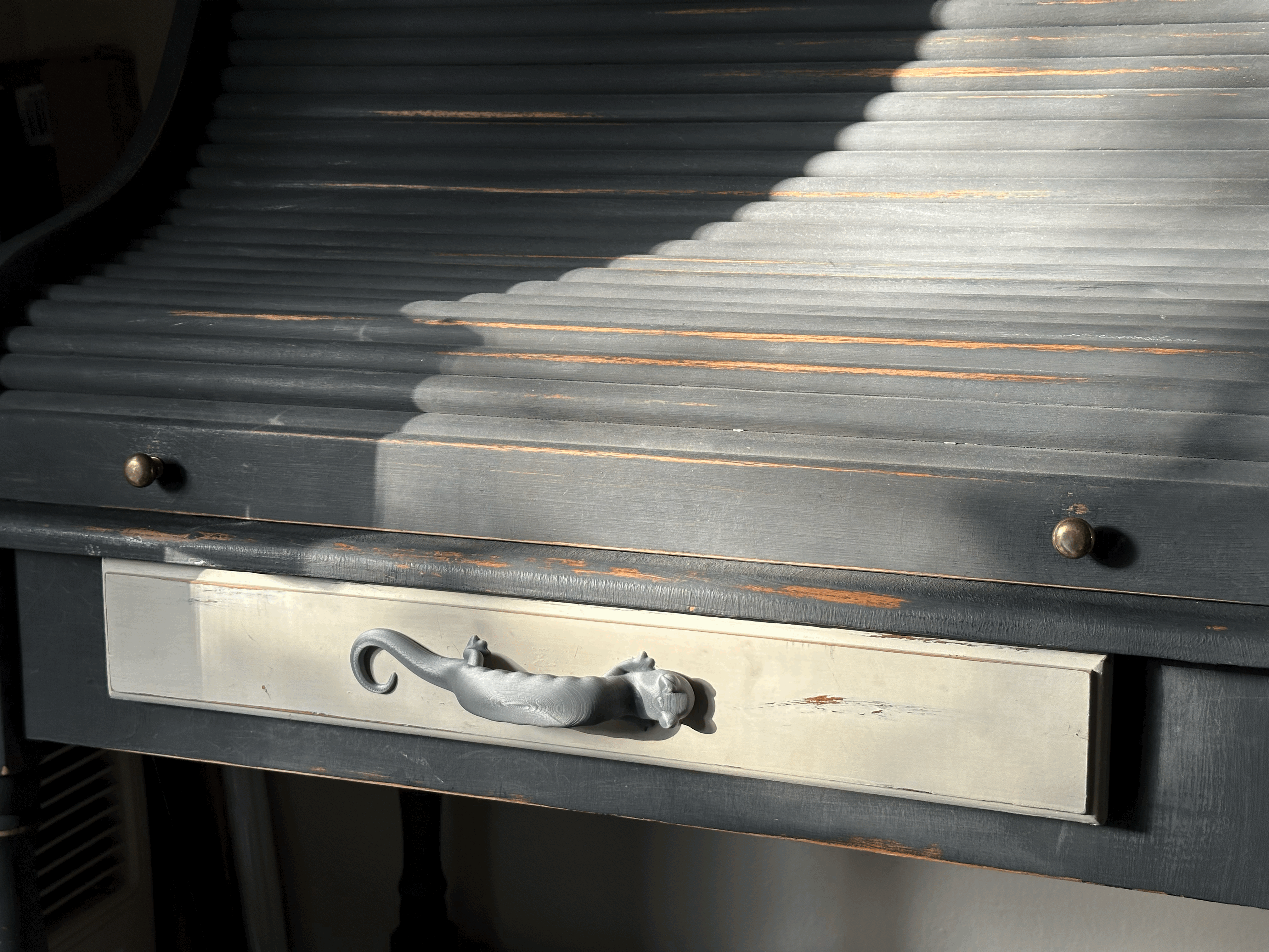 Tui in cái này để làm tay nắm ngăn kéo cho một cái bàn có nắp cuộn mà tui nhặt được từ thùng rác. Tay nắm ngăn kéo bị thiếu, nên tui đã tạo ra cái này để sửa nó.