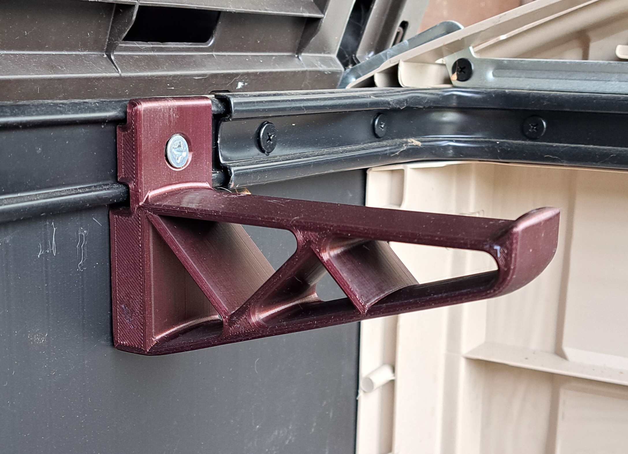 Tui thiết kế cái bracket này để sắp xếp cái nhà để xe đạp của tui, vì mấy chiếc xe scooter của mấy đứa nhỏ cứ để lung tung làm tui khó dắt xe đạp ra vô nhà xe Keter.