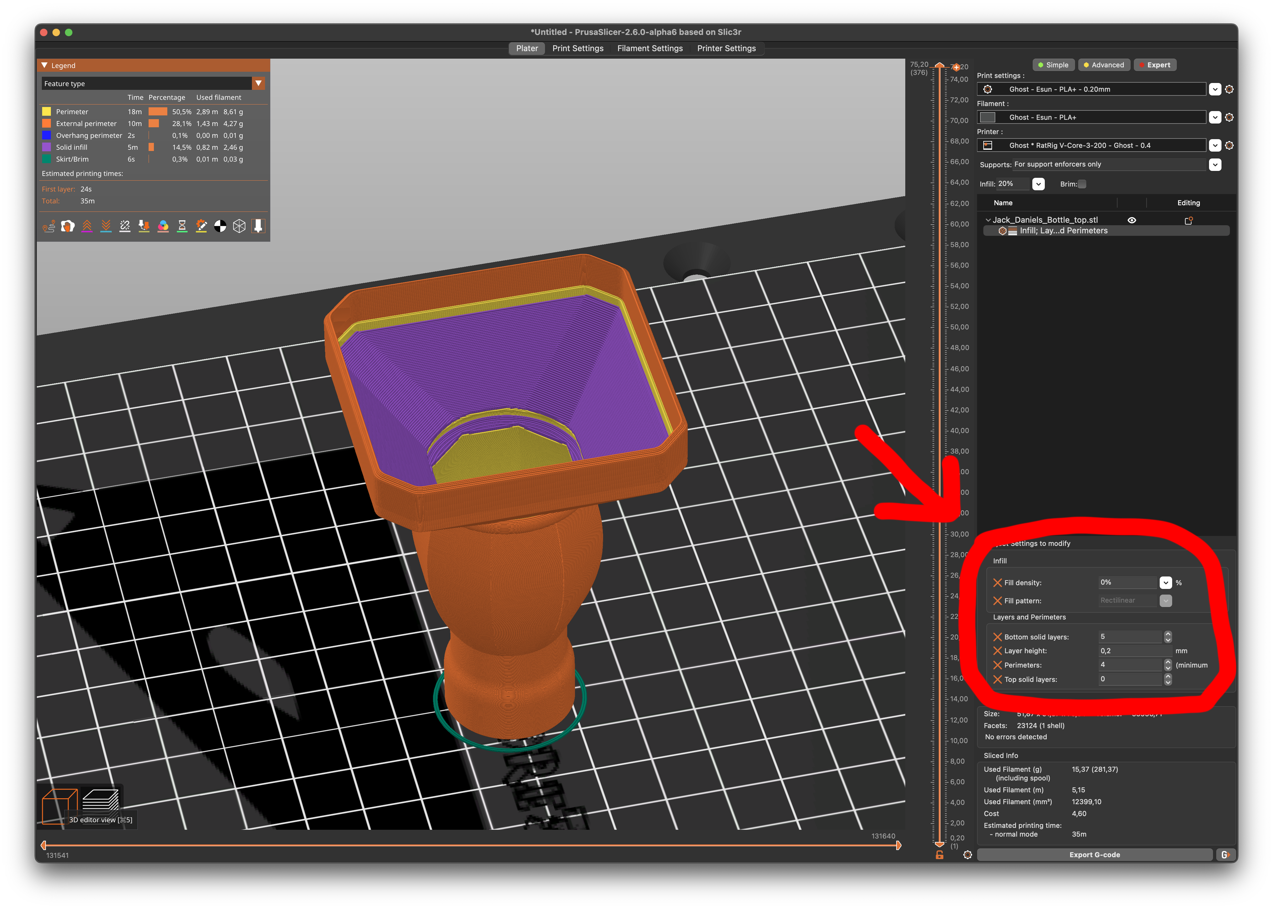 Phần trên của chai rượu whisky để chứa đồ cần in úp ngược và có thể hơi khó một chút. Để in rỗng, bạn cần sử dụng cài đặt này: (xem ảnh chụp màn hình) 4 Perimeters 0 lớp mặt trên đặc 0% infill Sử dụng nhiều làm mát và giảm tốc độ, Z hop cũng có thể hữu ích