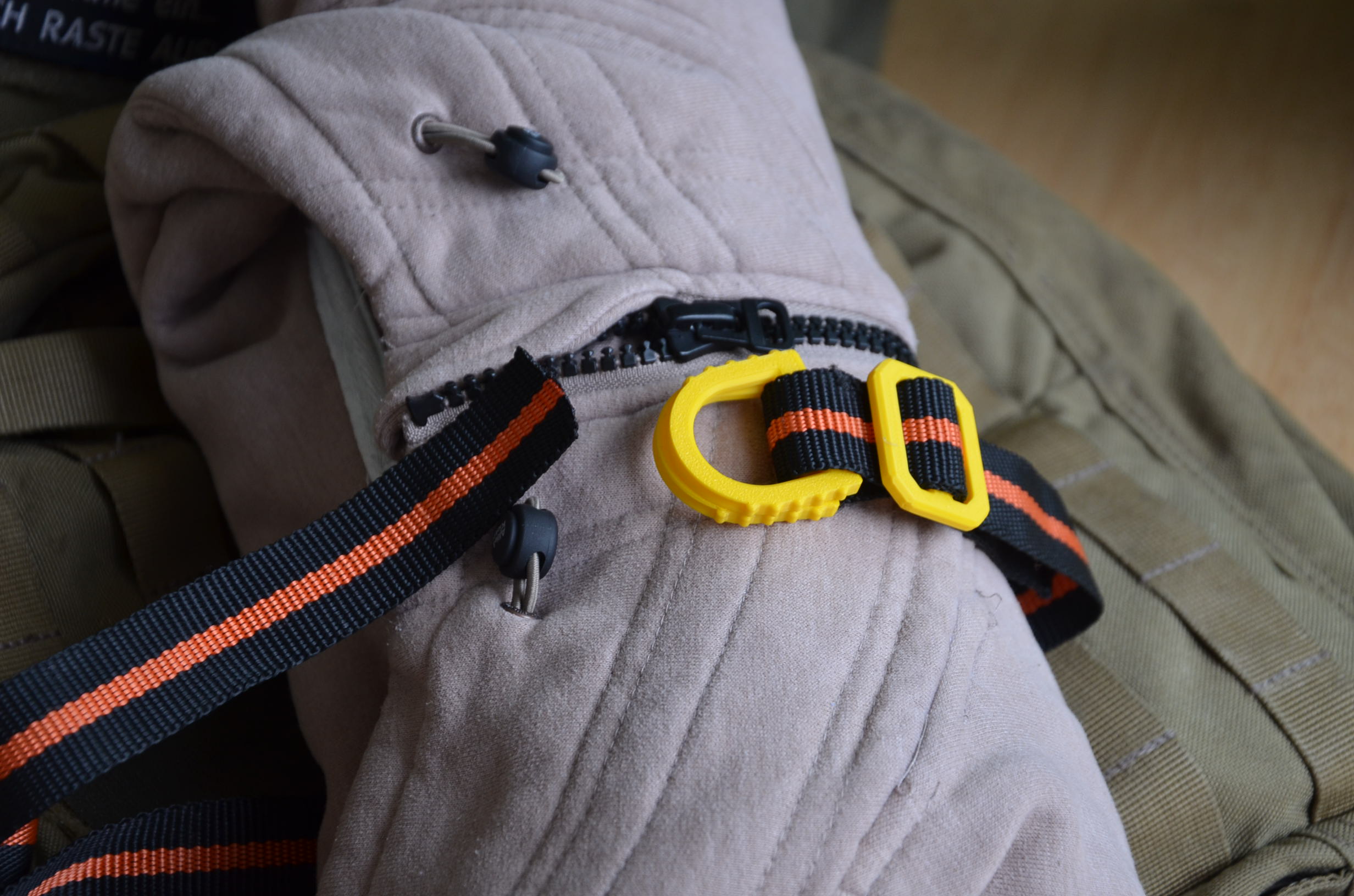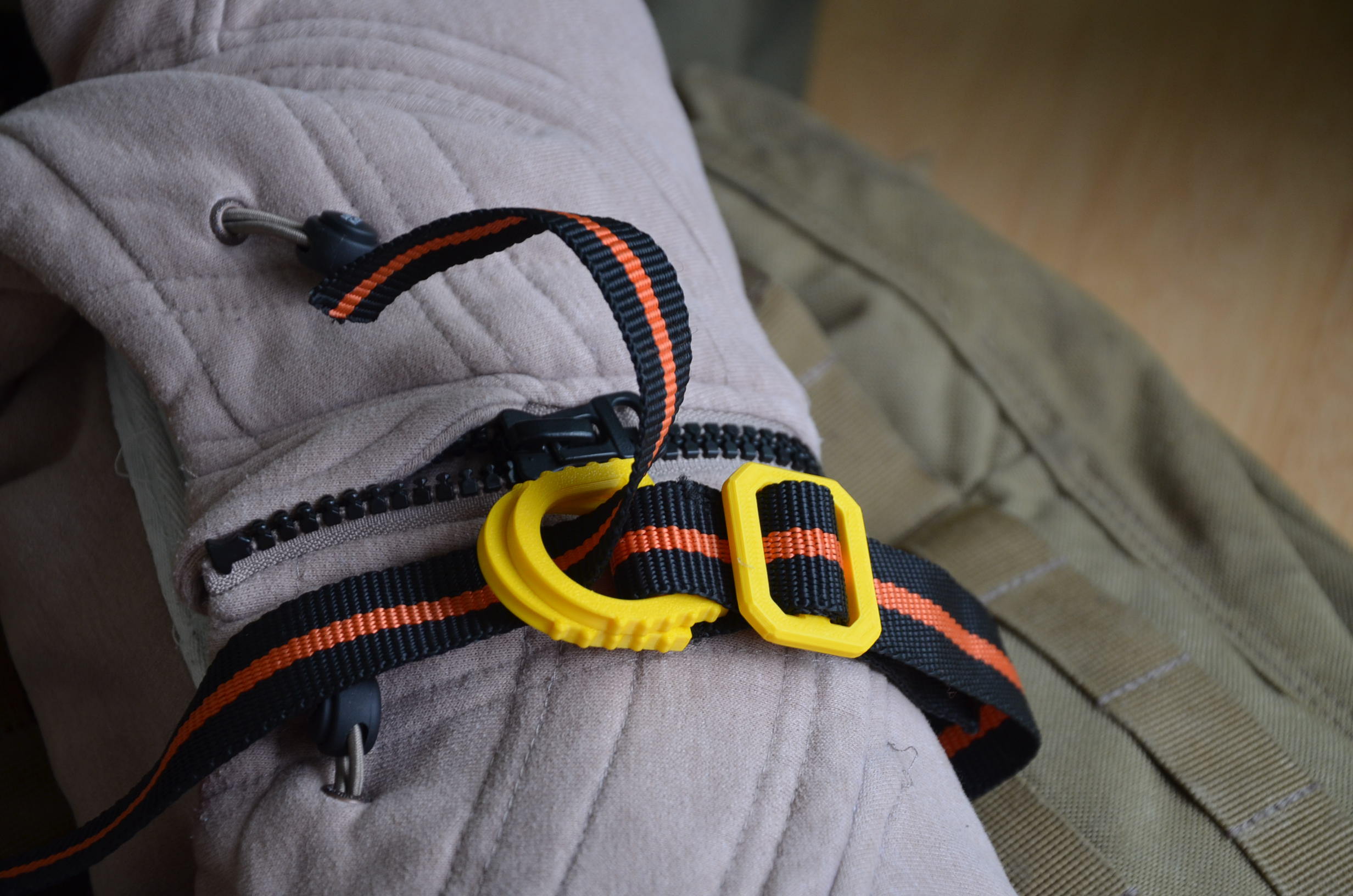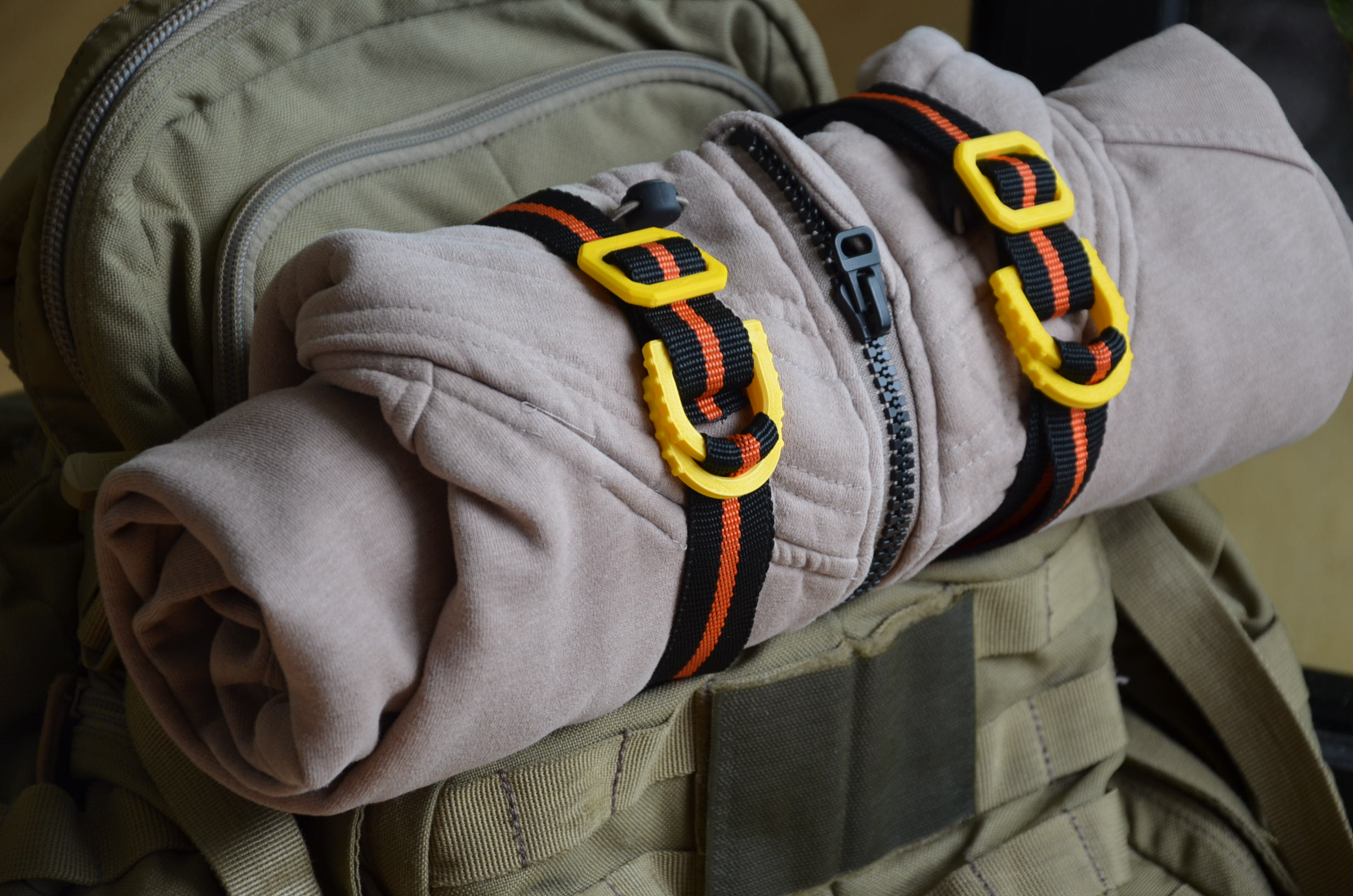 Cái khóa này có thể dùng với dây đai rộng 25mm (khoảng 1 inch) để làm thành một bộ khóa buộc chắc chắn. Giúp bạn dễ dàng gắn đồ lên ba lô, như túi ngủ, thảm và áo khoác. Cũng rất tuyệt để siết chặt túi đồ lại, giảm kích thước nếu bên trong có những món đồ "xốp".