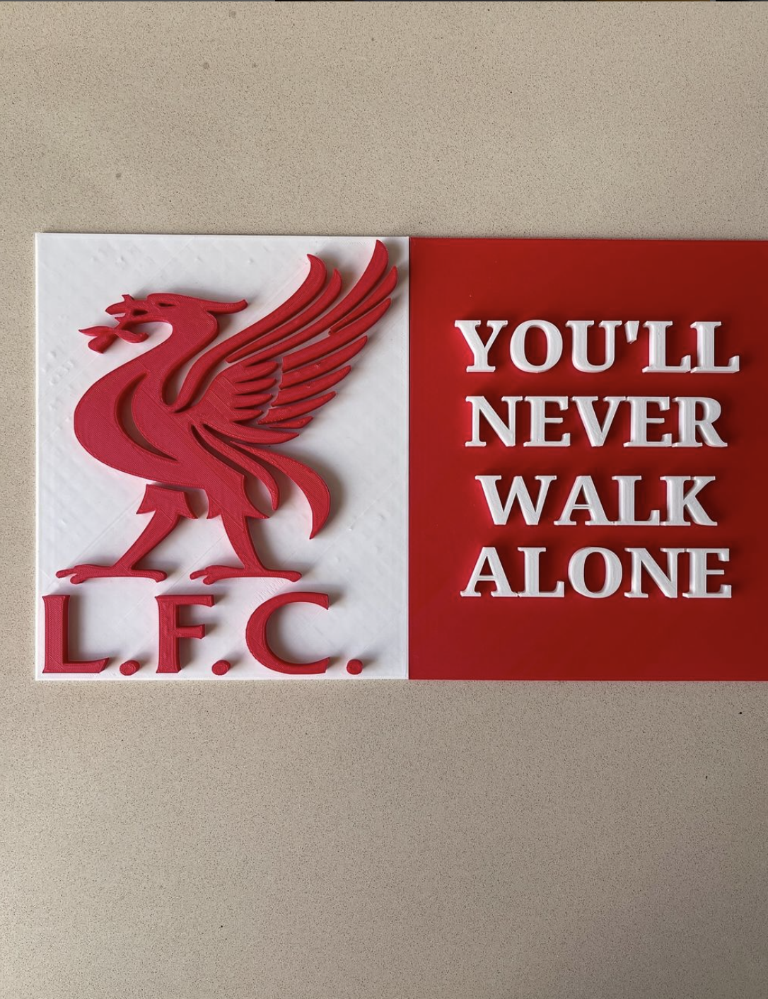 Tấm bảng này có logo Câu lạc bộ bóng đá Liverpool (LFC) cùng khẩu hiệu "YOU'LL NEVER WALK ALONE". Một món quà ý nghĩa cho các fan hâm mộ đội bóng.