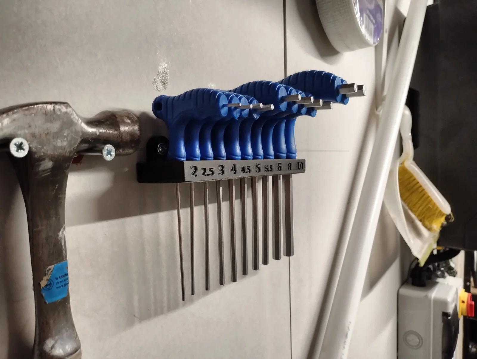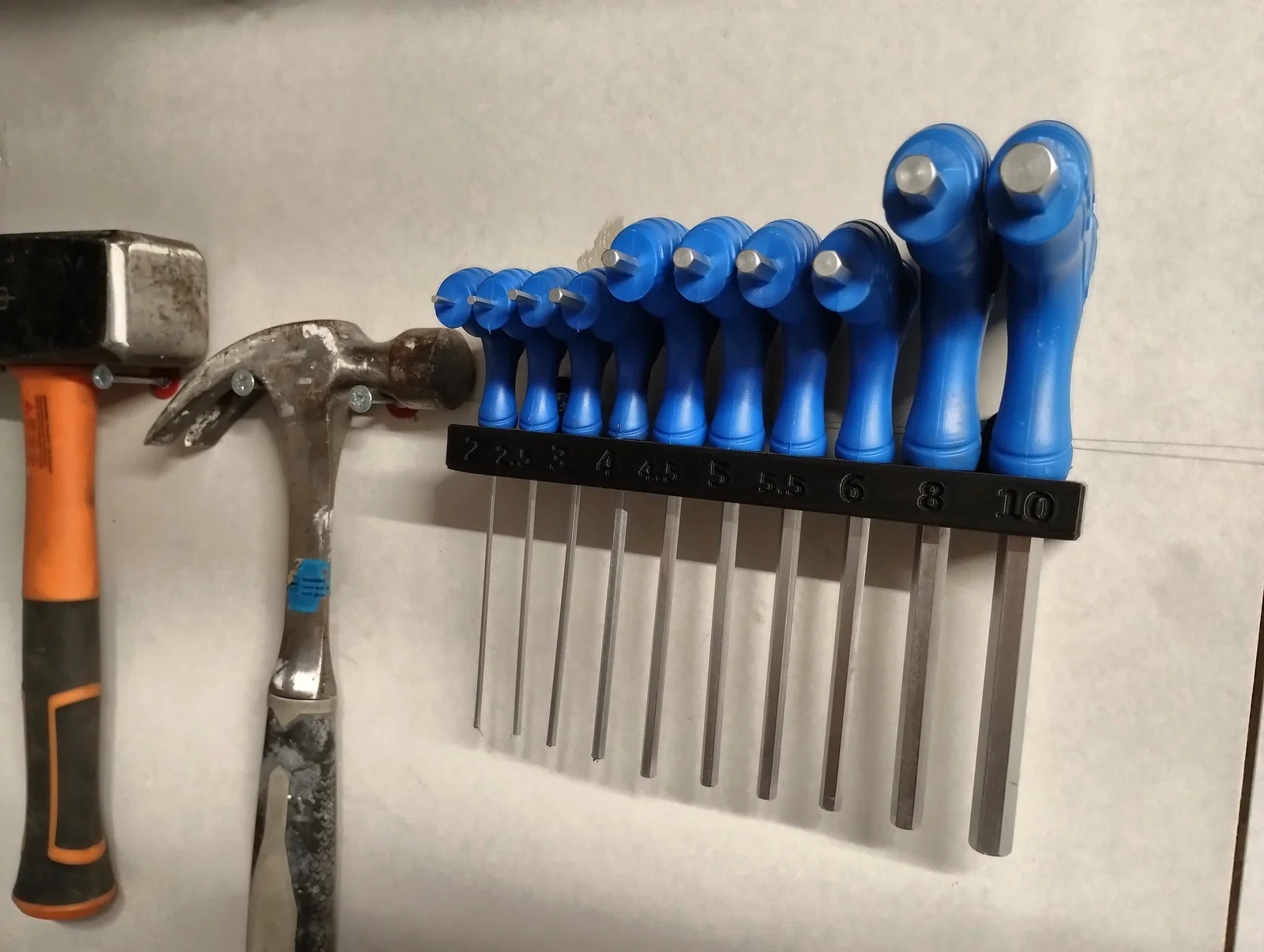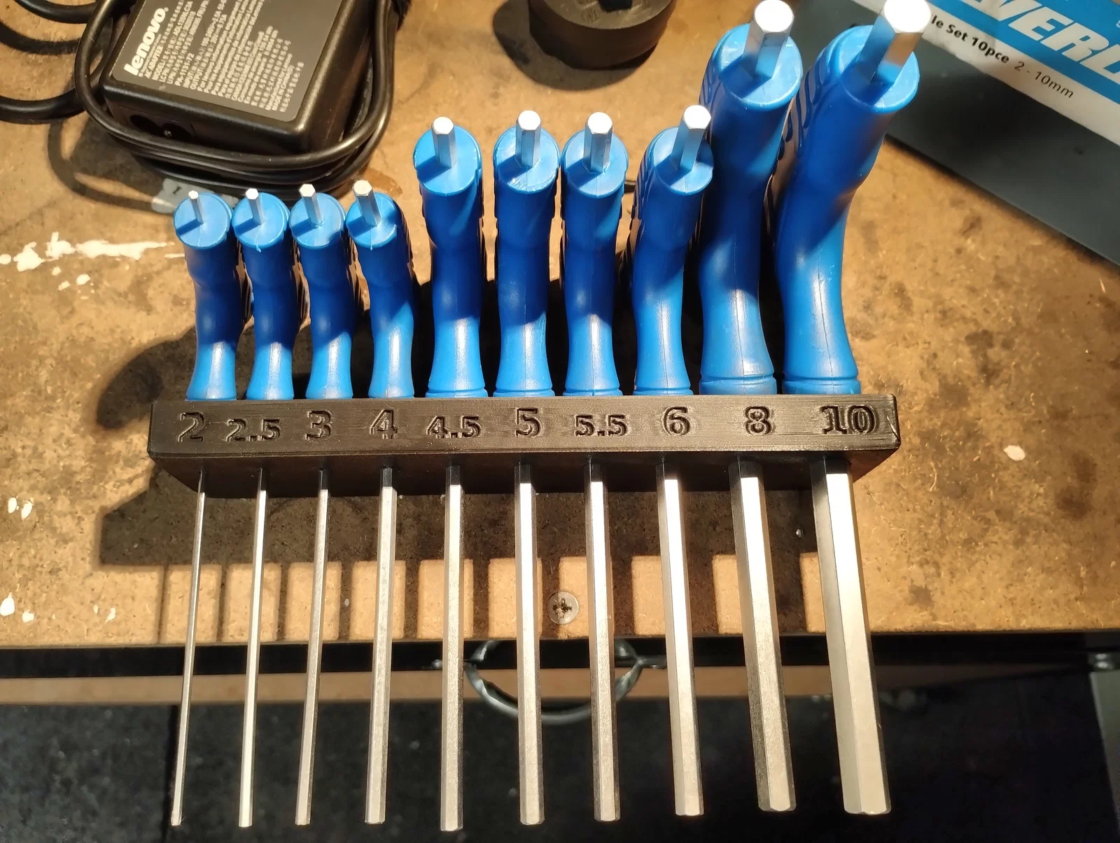 Tôi không tìm thấy giá treo tường cho T-Handle Hex Key Holder có khe cắm cho lục giác 5.5, 4.5 và 2.5, nên tôi đã tự làm để dọn dẹp bàn làm việc.