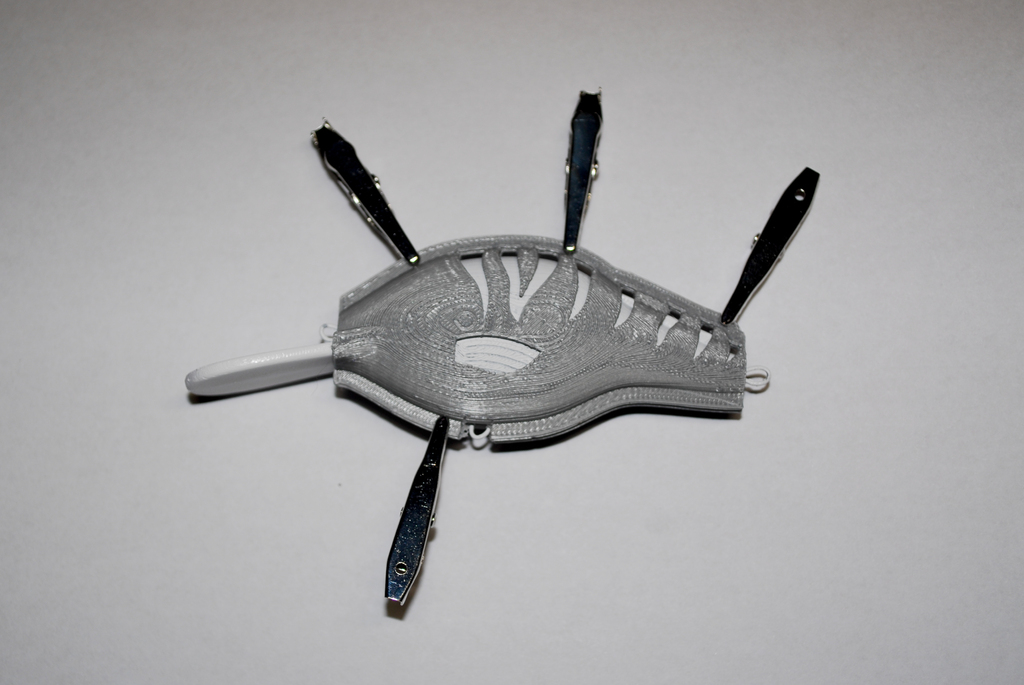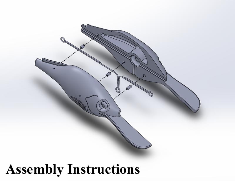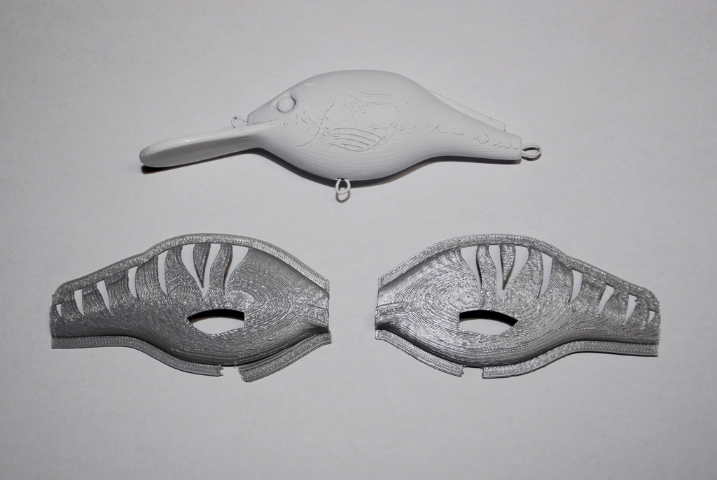 Con mồi được in làm hai nửa rồi dán lại với nhau. (Tui dùng keo siêu dính) Ba đoạn dây tóc 1.75mm nhỏ được dùng để hỗ trợ căn chỉnh hai nửa khi ghép lại. Một đoạn dây thép (tui dùng dây an toàn xe máy) được uốn (xem hình để biết hình dạng) để tạo vòng tròn để buộc dây câu và móc câu, rồi đặt vào giữa hai nửa trước khi dán lại.