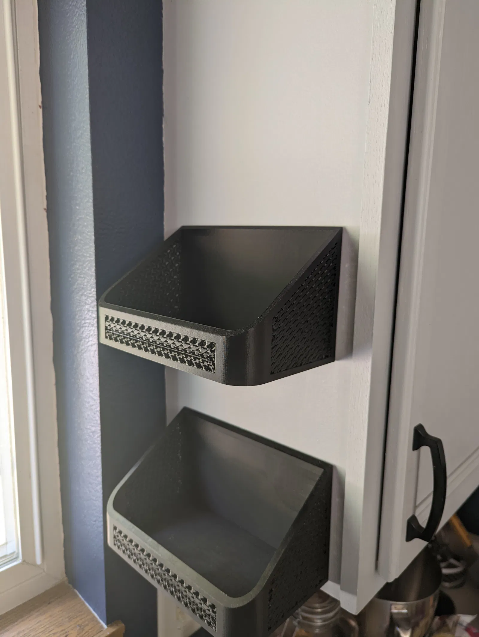 Đây là cái rổ nhỏ tui hay để củ hành, đồ này nọ. Nó được treo bằng cái pát đuôi én được dán lên tường bằng keo 3M. Có cả cái rổ hoàn chỉnh và cái khung riêng để bạn có thể dùng cái khung làm modifier để thấy các kiểu in lưới mở như cái gyroid trong hình hoặc in đặc cũng được. Tui khuyên là nên dán keo 3M lên cái pát trước, rồi gắn cái pát vô cái rổ, sau đó úp ngược cái rổ xuống để dán lên tường. Xong rồi rút cái rổ ra, lật ngửa cái rổ lại và gắn vô pát cho đúng chiều.
