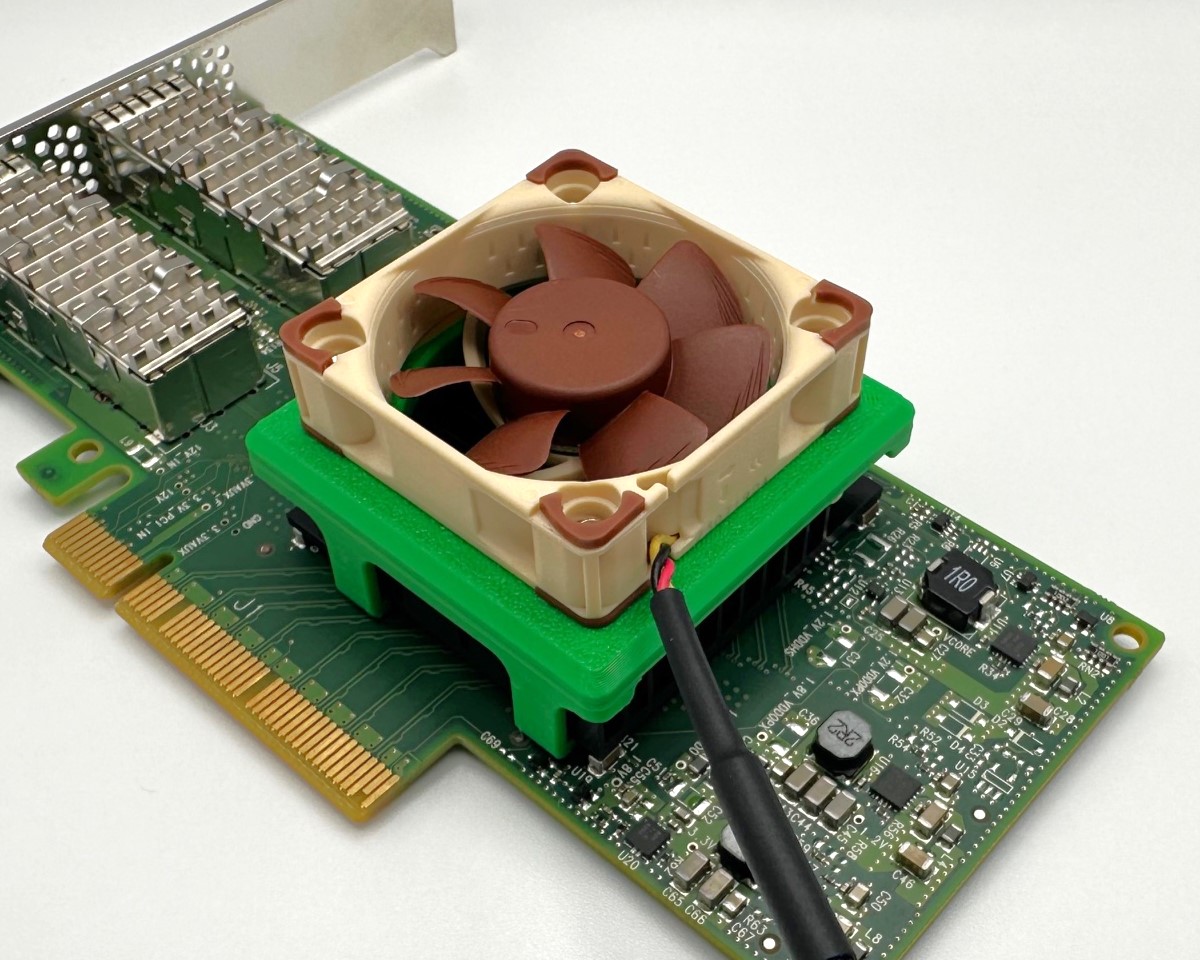 Cái bracket này cho phép bạn gắn quạt 40mm lên tản nhiệt của card mạng Mellanox ConnectX-4 (kích thước tản nhiệt 45x45x11mm). Nó được thiết kế với quạt Noctua NF-A4x10 FLX, nhưng các quạt 40mm khác cũng có thể xài được.