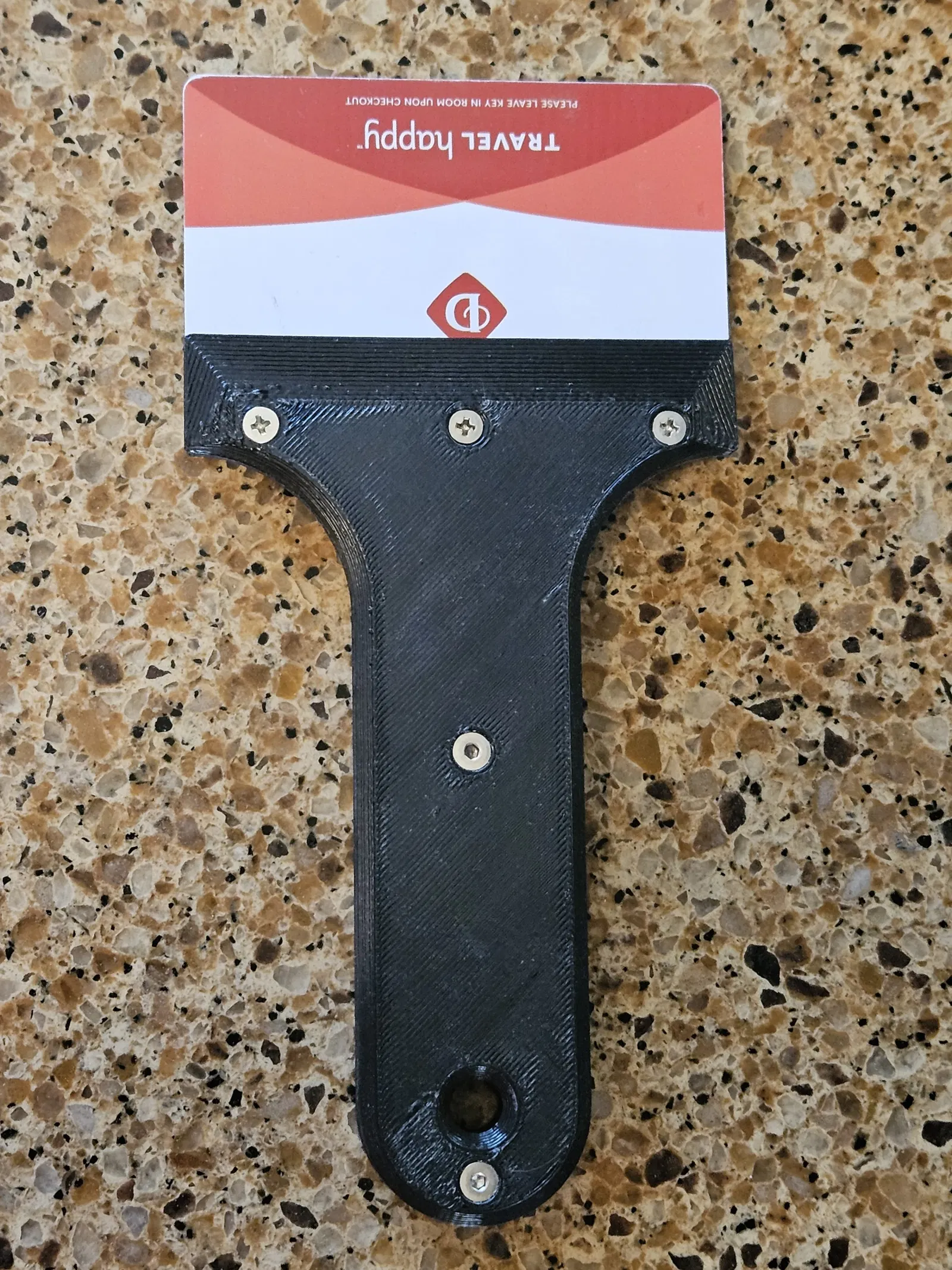 Tôi giữ các thẻ khóa khách sạn cũ để sử dụng làm bộ phế liệu linh hoạt. Chúng đặc biệt hữu ích để cạo kính chắn gió của xe tải của tôi vào buổi sáng lạnh. Tâm trí bạn, tôi chỉ nhận được một chút sương giá. Đây không phải là cho việc cạo hạng nặng. Nó được làm thành 3 mảnh để không cần hỗ trợ. Miếng đệm dày 0,6 mm và sẽ dẫn đến nhiễu 0,1 mm đến 0,2 mm để cung cấp lực kẹp tốt. Độ dày bộ phận là 3 mm nên chúng sẽ kết thúc ở cả hai bên. Bạn cần mặt giường của đáy đáy để được phẳng sau khi các đai ốc được đặt để đảm bảo rằng có lực kẹp chẵn và đủ trên thẻ, vì vậy bạn có thể cần phải cát nhẹ sau khi các đai ốc được đặt. Tôi cố tình trộn tôi với ổ Hex ở đầu tay cầm và đầu Phillips trong kẹp.
