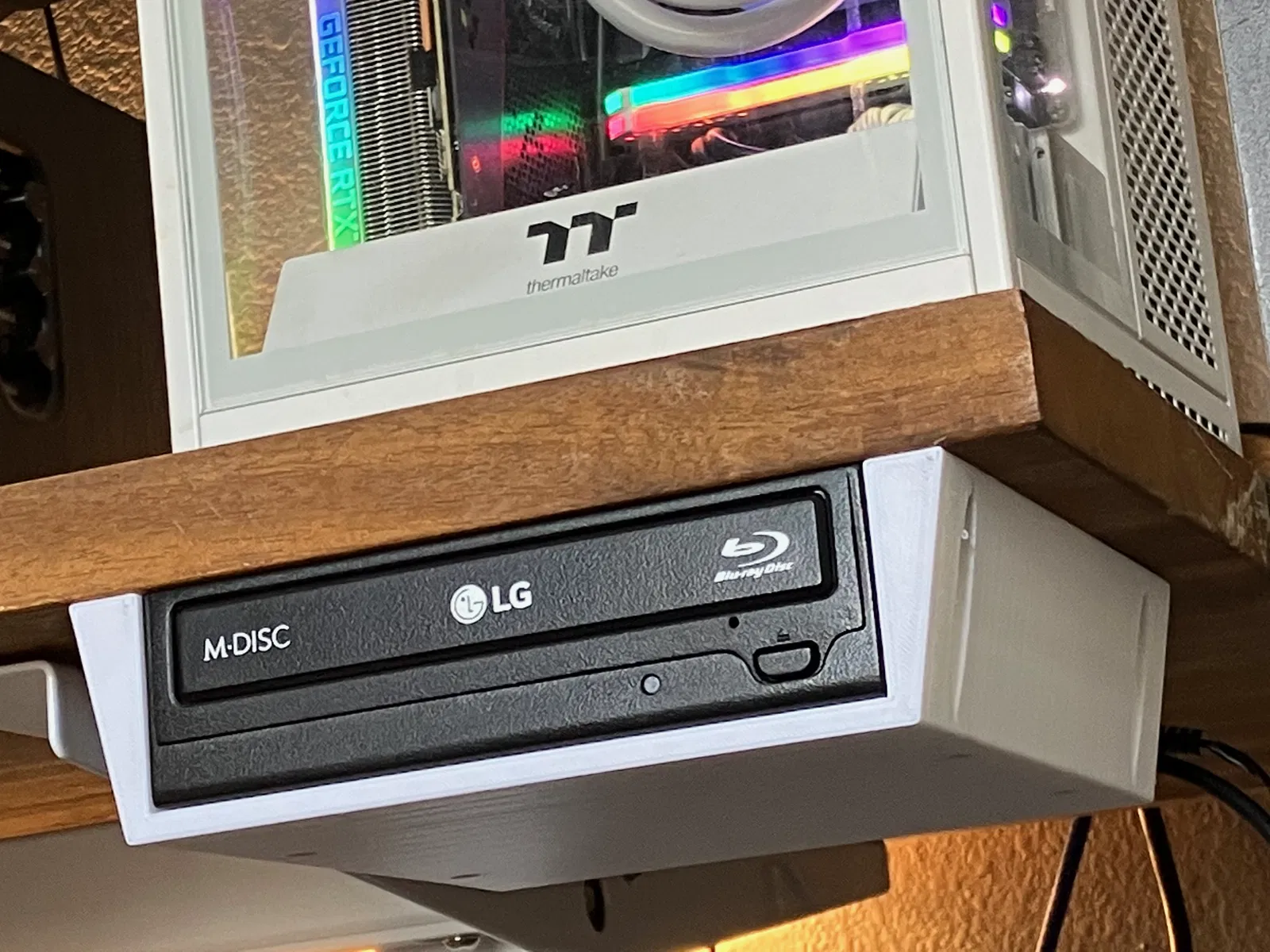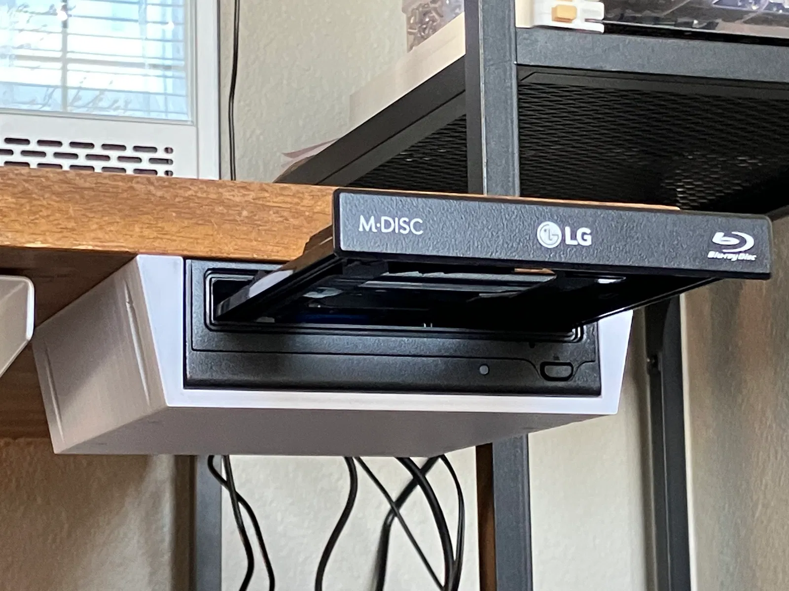 Giá treo gọn gàng, lắp dưới bàn cho ổ ghi đĩa Blu-ray LG WH16NS40. Dân tình hay dùng cái này với MakeMKV. Cần 4 vít gỗ nhỏ và vài con ốc M3 ngắn để cố định ổ đĩa vào vỏ treo.