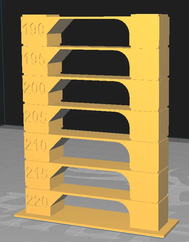 Mô hình Tháp Nhiệt Độ PLA, kiểm tra dải nhiệt độ in từ 220 độ C xuống 190 độ C. Lưu ý: 70 độ C là nhiệt độ không phù hợp để in PLA.