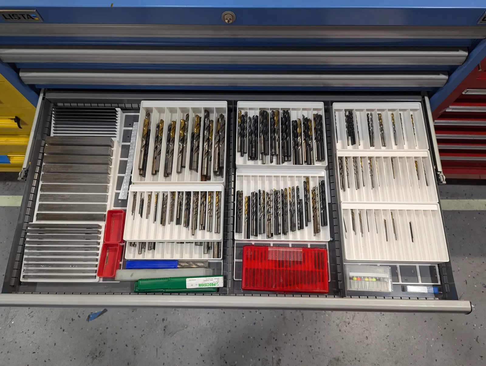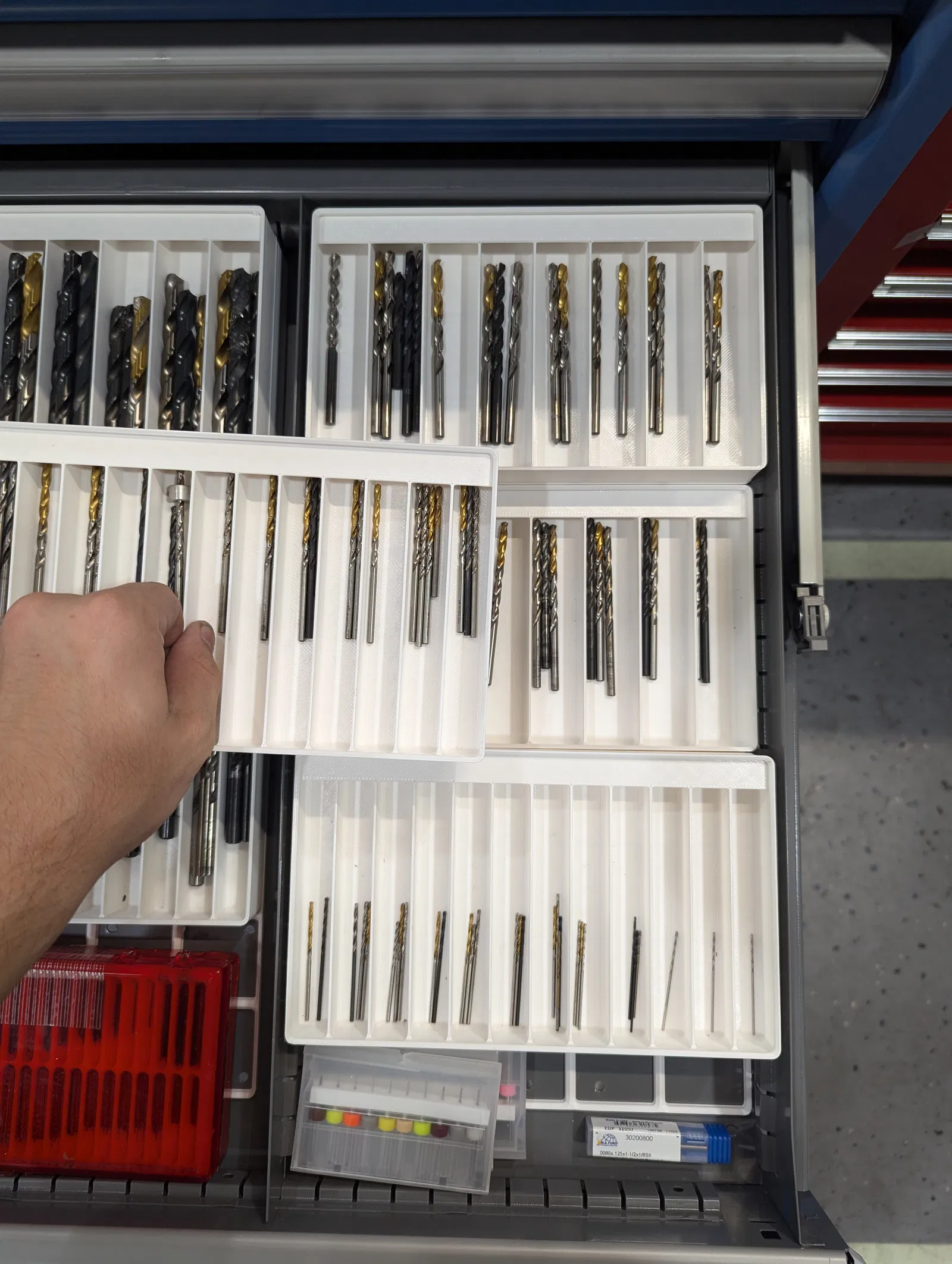 Các khay sắp xếp mũi khoan tương thích Gridfinity dành cho các kích thước số, chữ cái và phân số Imperial. Bao gồm các kích cỡ từ 1-60 (60), A-Z (26), 1/16-½" (29). Các khay có chiều rộng 5 đơn vị và chiều dài từ 3-5 đơn vị với 7-12 ngăn bên trong tùy thuộc vào kích thước mũi khoan và bộ chia. Các khay có thể xếp chồng lên nhau, hai khay vừa với ngăn kéo cao 2 đơn vị của Lista, và chứa ít nhất 5-6 mũi khoan cho mỗi kích cỡ.