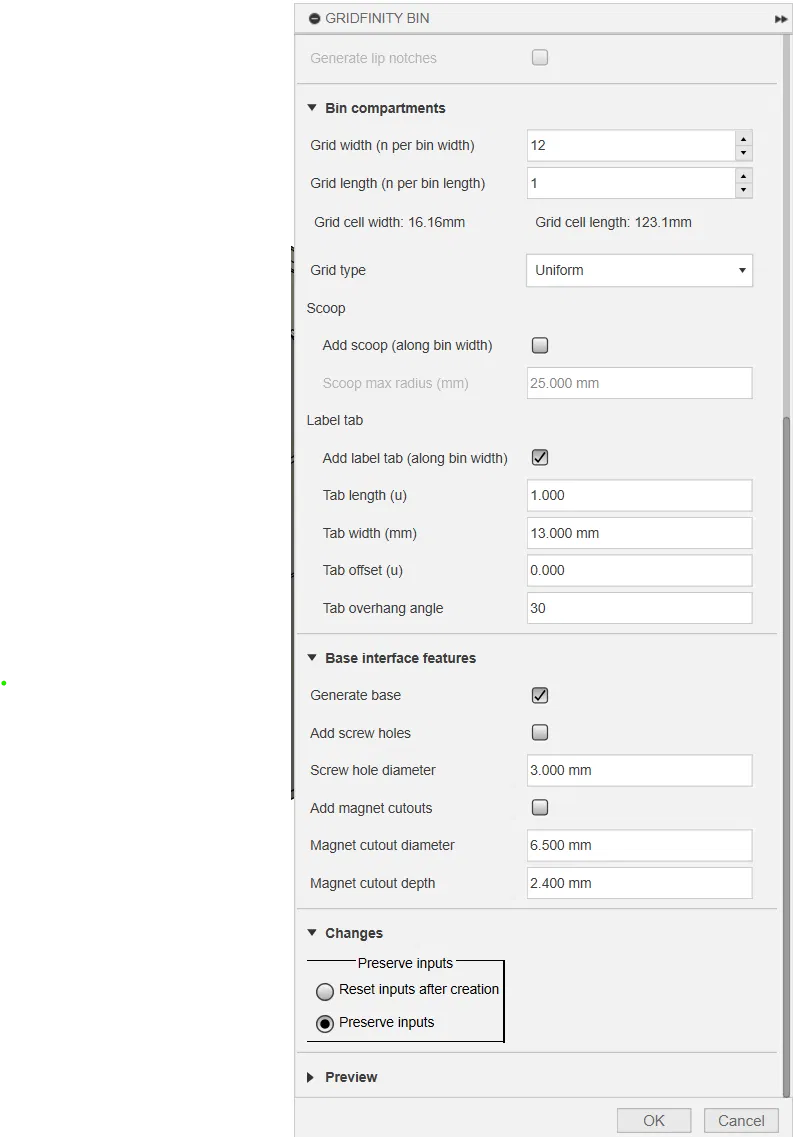 Tất cả các khay được tạo bằng plugin GridfinityGenerator tuyệt vời cho Fusion 360. Tôi đã sử dụng hầu hết các cài đặt mặc định ngoại trừ “Main Dimensions”, loại khay Hollow, Bin Compartments, Label Tab (thông số mặc định), và không có khe cắm nam châm. Ảnh chụp màn hình các thông số cho khay 3x5x3.5x12 được hiển thị trong ảnh.