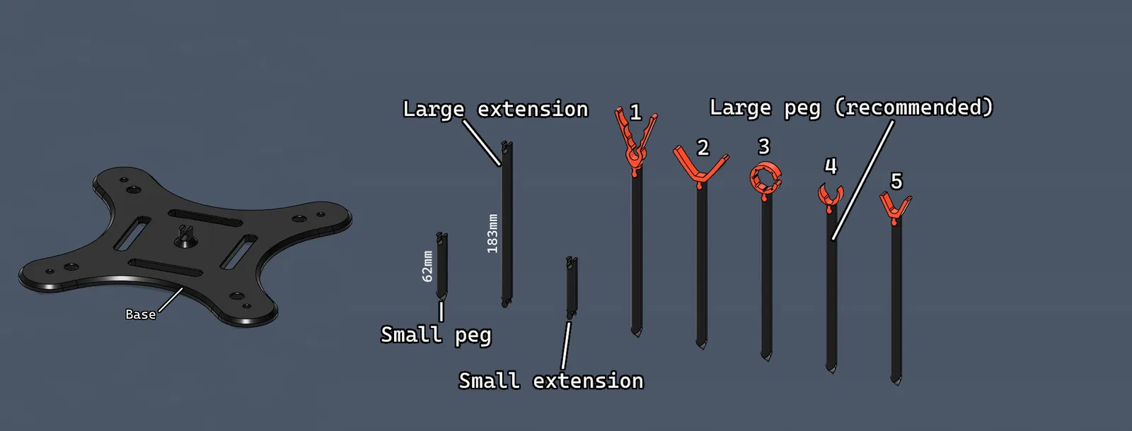 Cài giữ cần câu của bạn, hoặc nhiều cần, chắc chắn - không cần support. Tui gợi ý in 1 cái extension, scale 250% là ngon nhất. Dung sai 0.2mm giữa chốt và đế. Mấy cái part có thể nhỏ hơn mấy ông nghĩ nha.