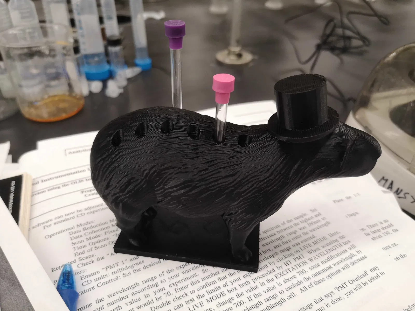Mô hình giá đỡ ống NMR hình Capybara này, được thiết kế theo yêu cầu của một nghiên cứu sinh lấy cảm hứng từ Phòng thí nghiệm Romero tại UCSD, có sẵn ở hai phiên bản: 3x và 12x. Hoàn hảo cho các nhà khoa học cần một giải pháp lưu trữ độc đáo và vui nhộn cho các ống NMR của họ.