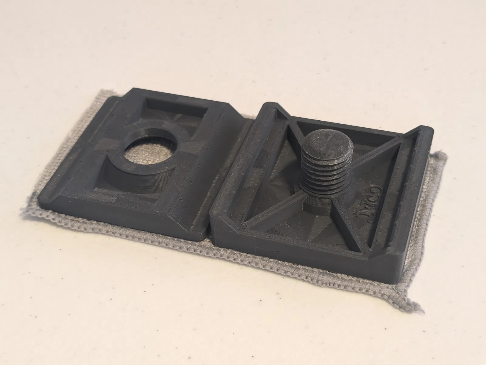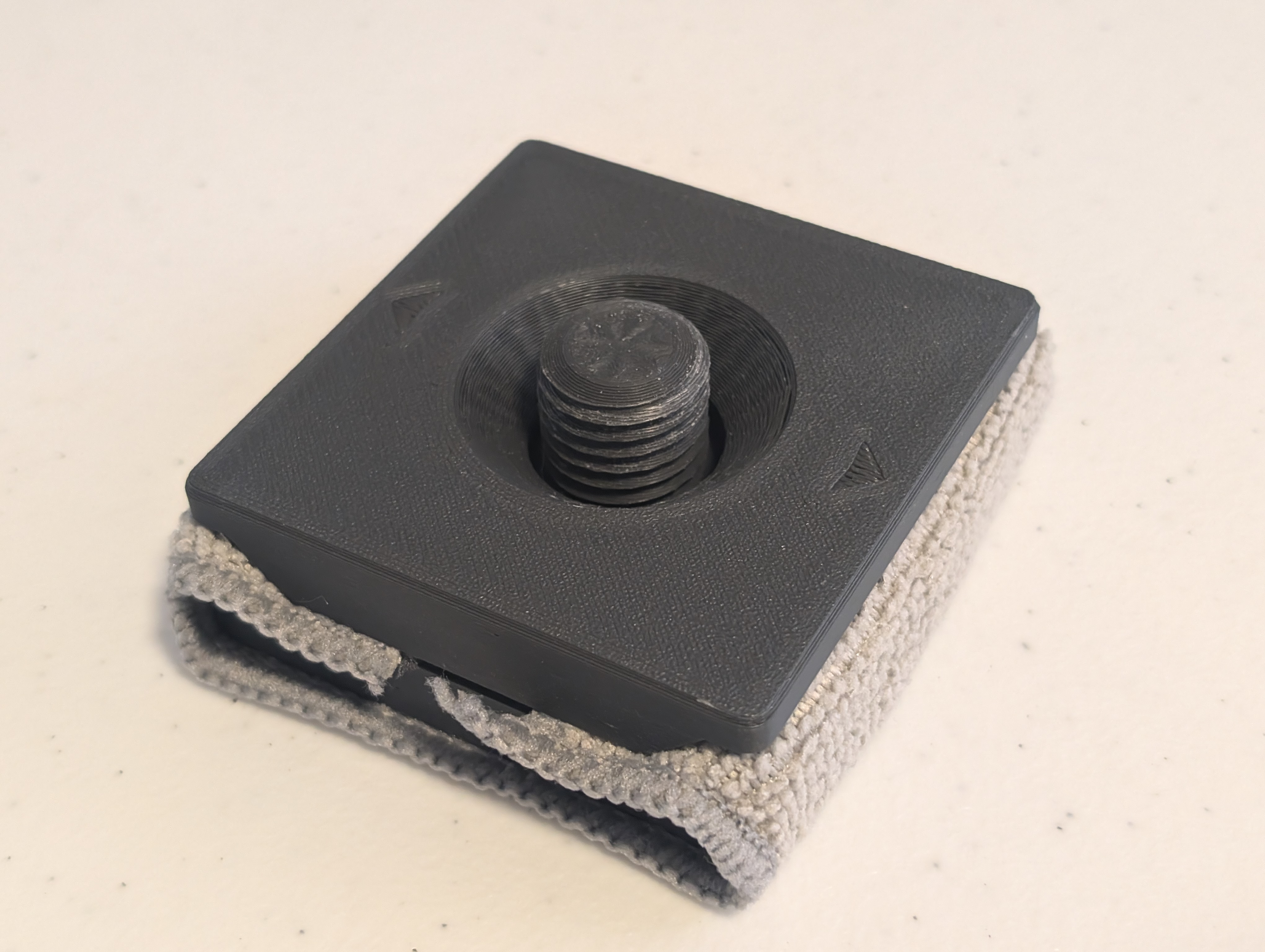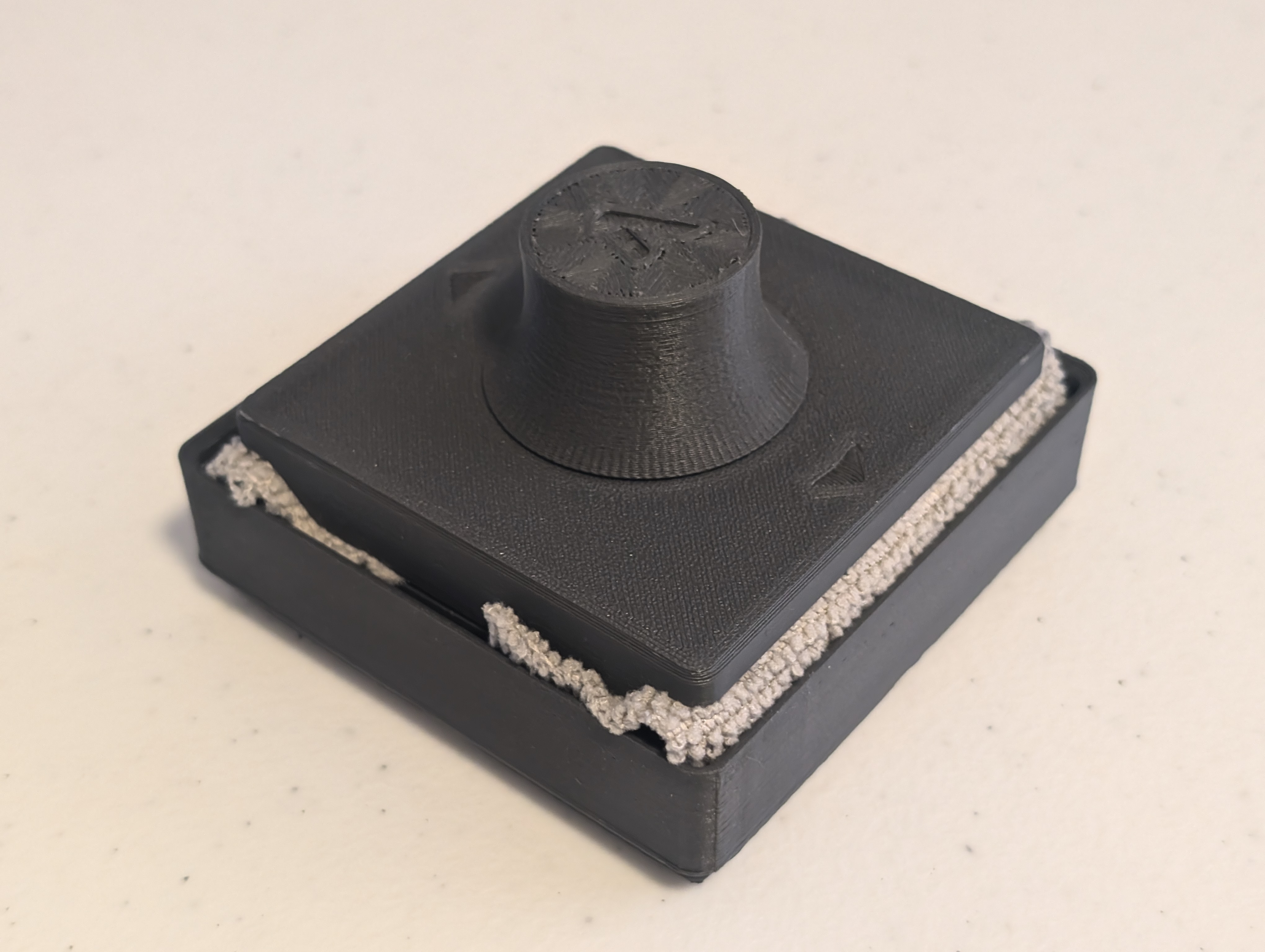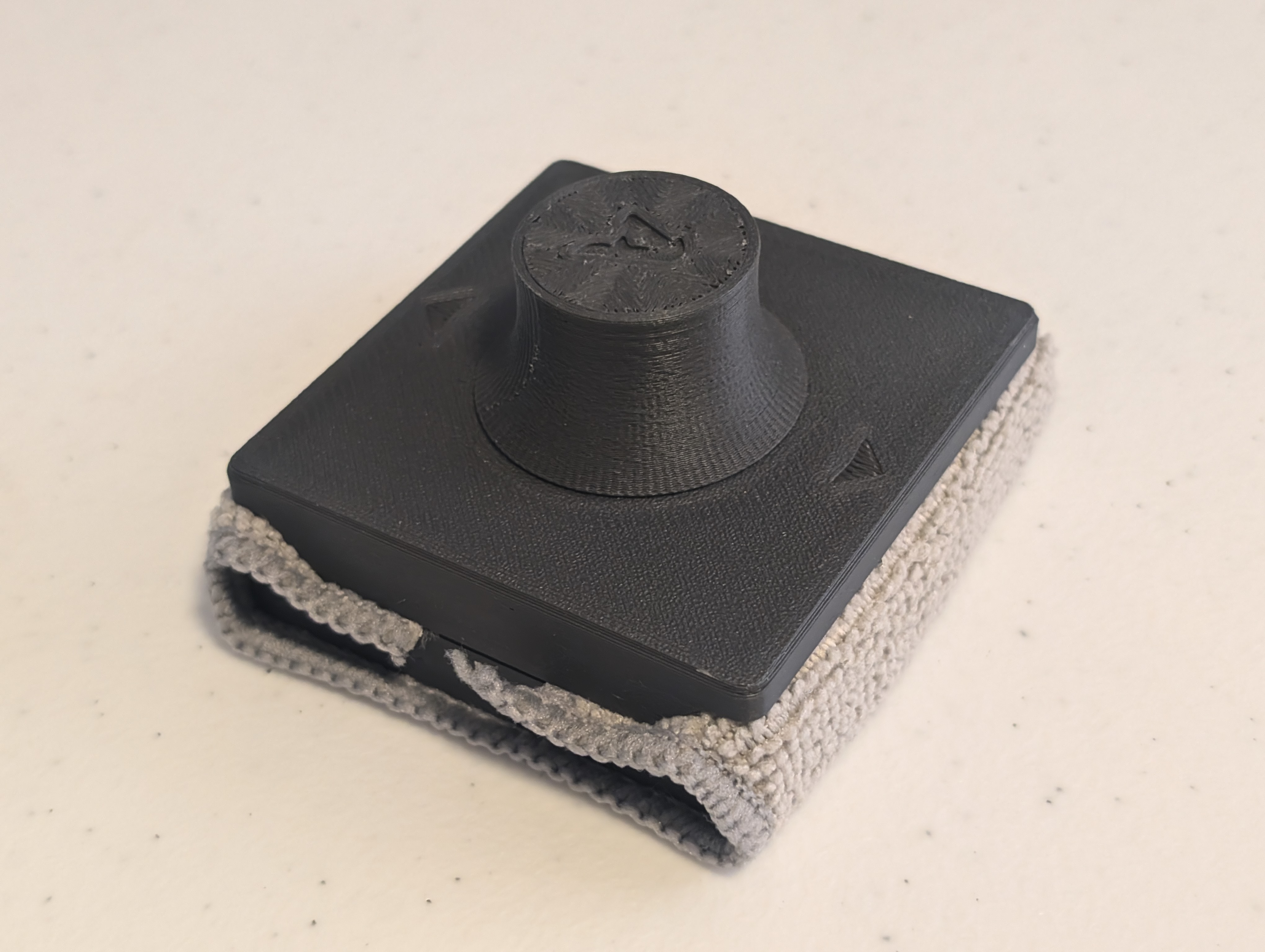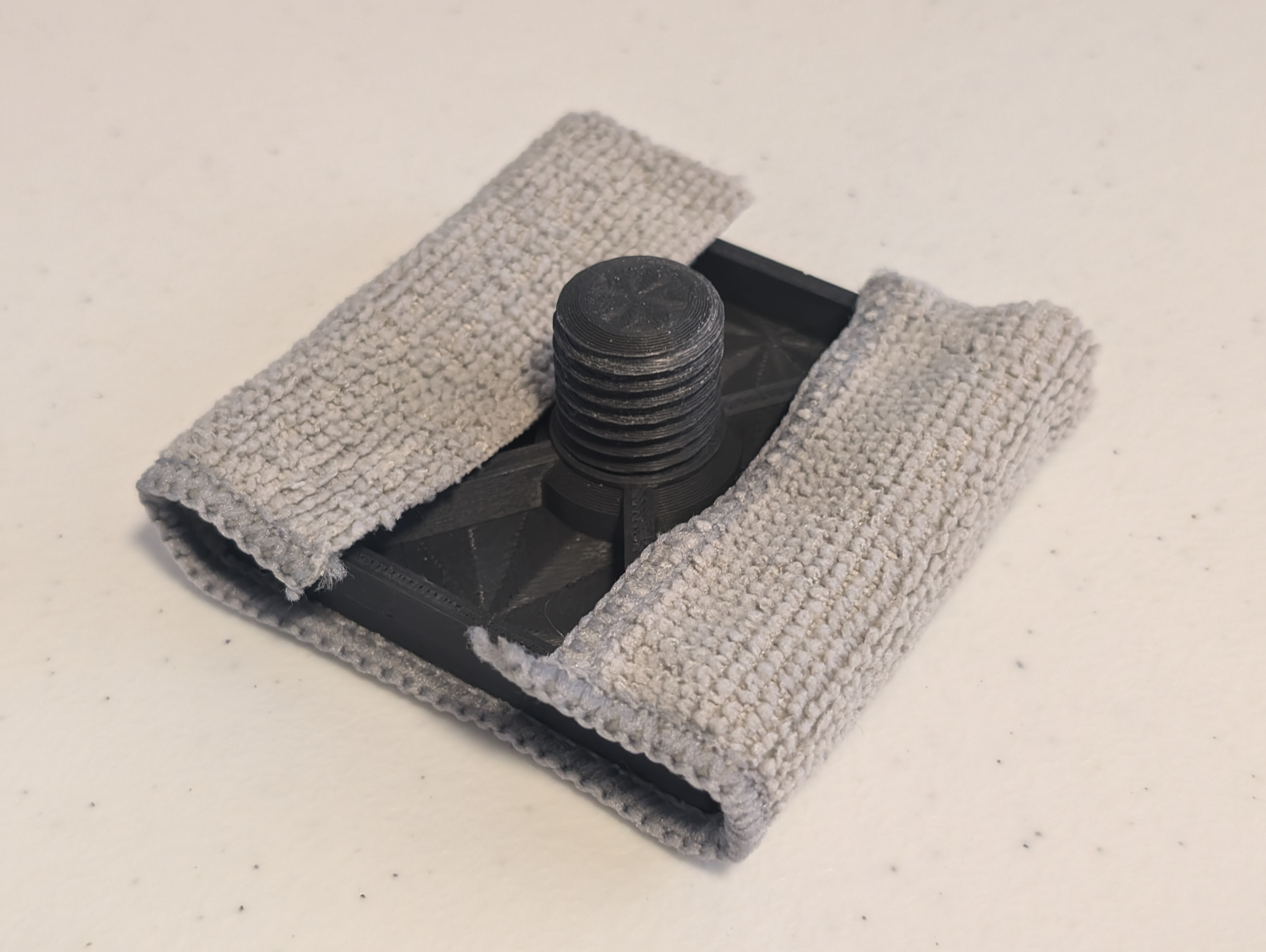 Tui muốn có một dụng cụ vệ sinh khay in phù hợp với Gridfinity nên đã lấy cảm hứng từ mẫu cũ và chỉnh sửa lại để vừa ô 4x4. Cách làm đơn giản, chỉ cần cắt vải theo kích thước đế và có thể xử lý mép vải để tránh bị tưa.