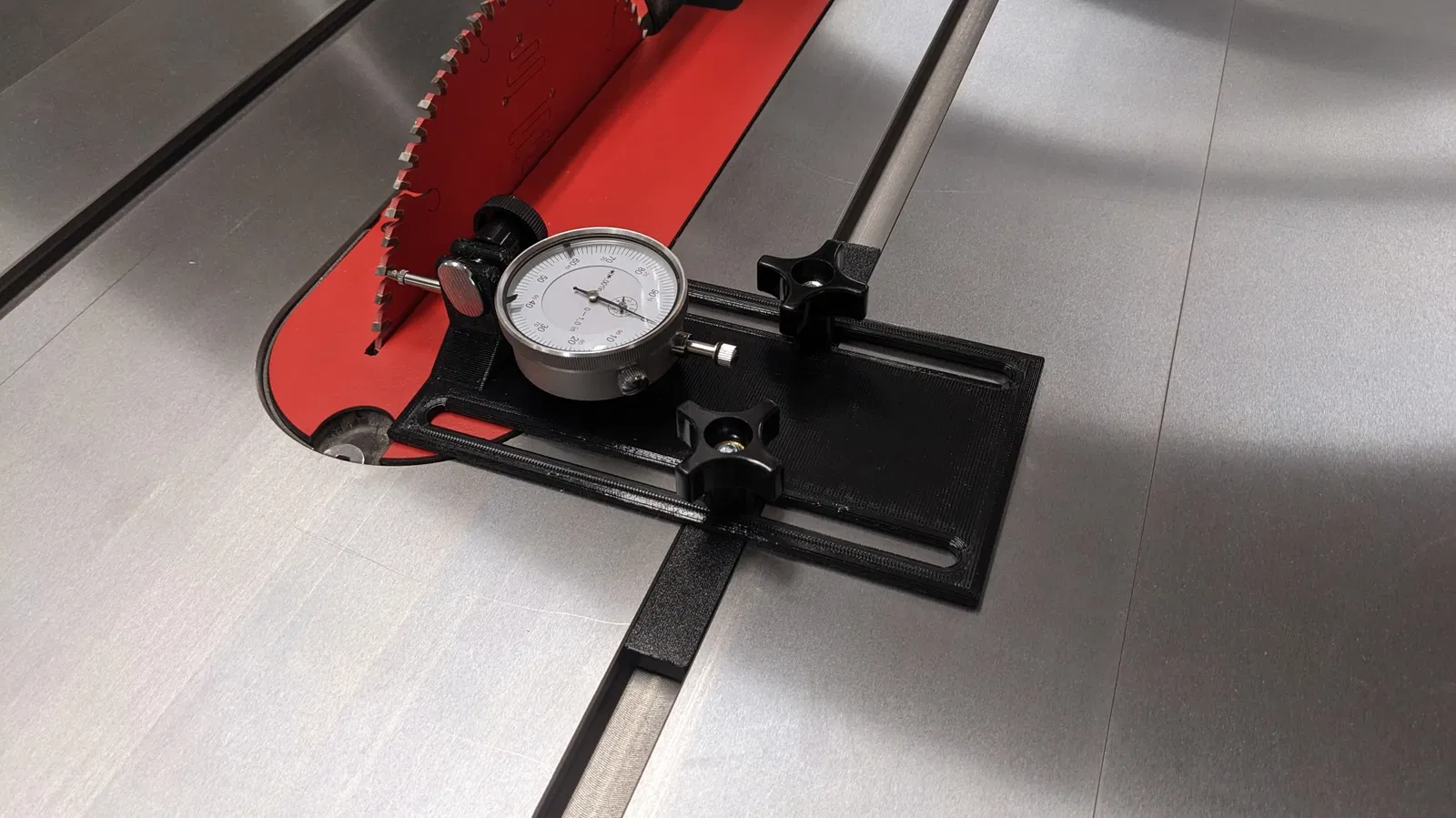 Công cụ để căn chỉnh chính xác bảng cưa trên đầu vào lưỡi dao và hàng rào để cắt chính xác bằng cách sử dụng chỉ báo quay số