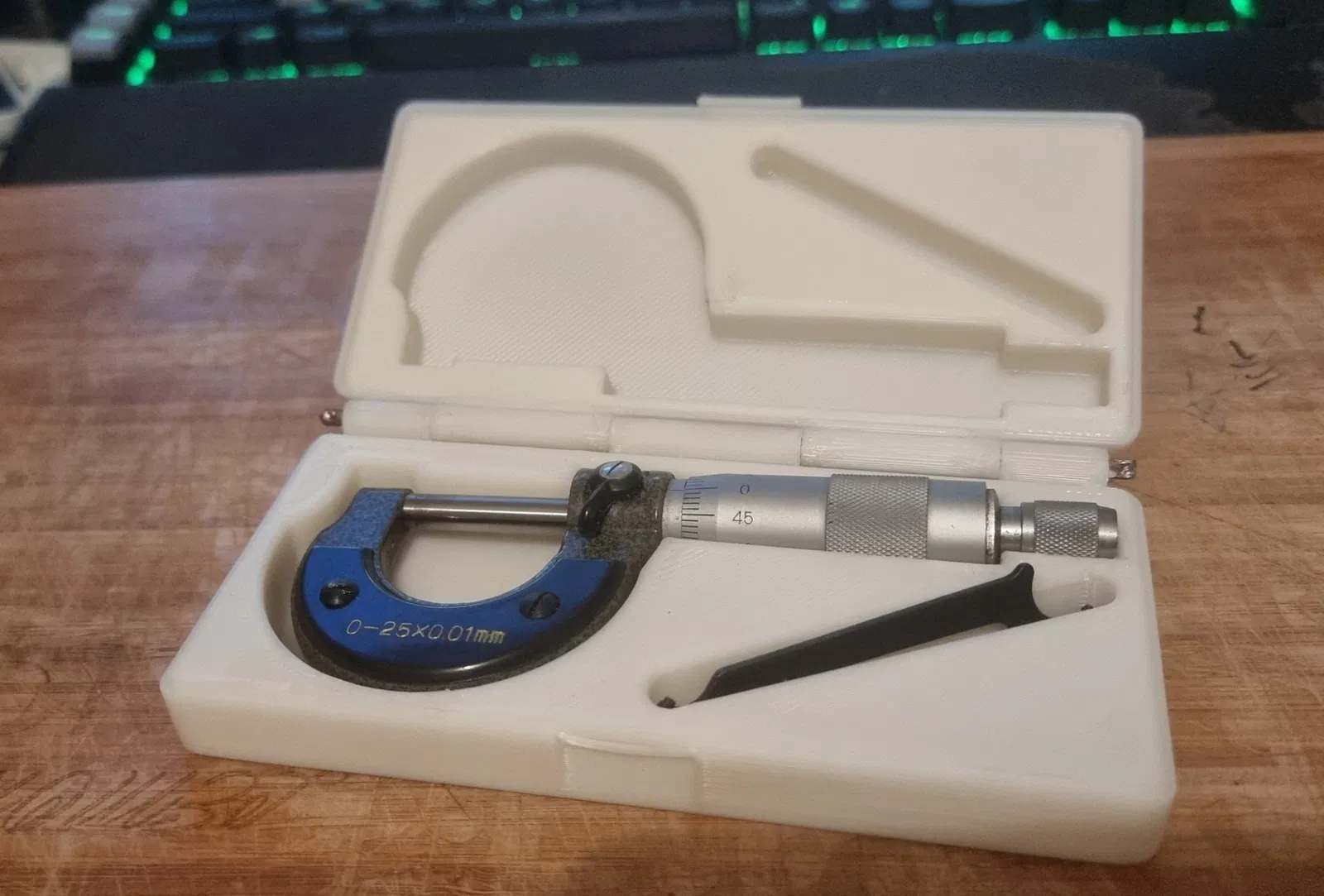 Trường hợp ban đầu quá nông đối với micromet của tôi, cũng như chỉ hơi ngắn. Ngoài việc mở rộng độ sâu và chiều dài, tôi cũng đã sửa đổi một lượng nhỏ hình dạng xung quanh micromet và thay đổi không gian cho cờ lê, vì tôi dài 75mm và tôi không muốn nó vỗ vào quá nhiều. Phiên bản tách biệt là những gì tôi đã in và sử dụng thanh thép nhẹ 3,2mm cho bản lề. Tôi đã in cái này trên CR-X CREALITY của mình với vòi phun 0,6mm ở chiều cao lớp 0,4mm.