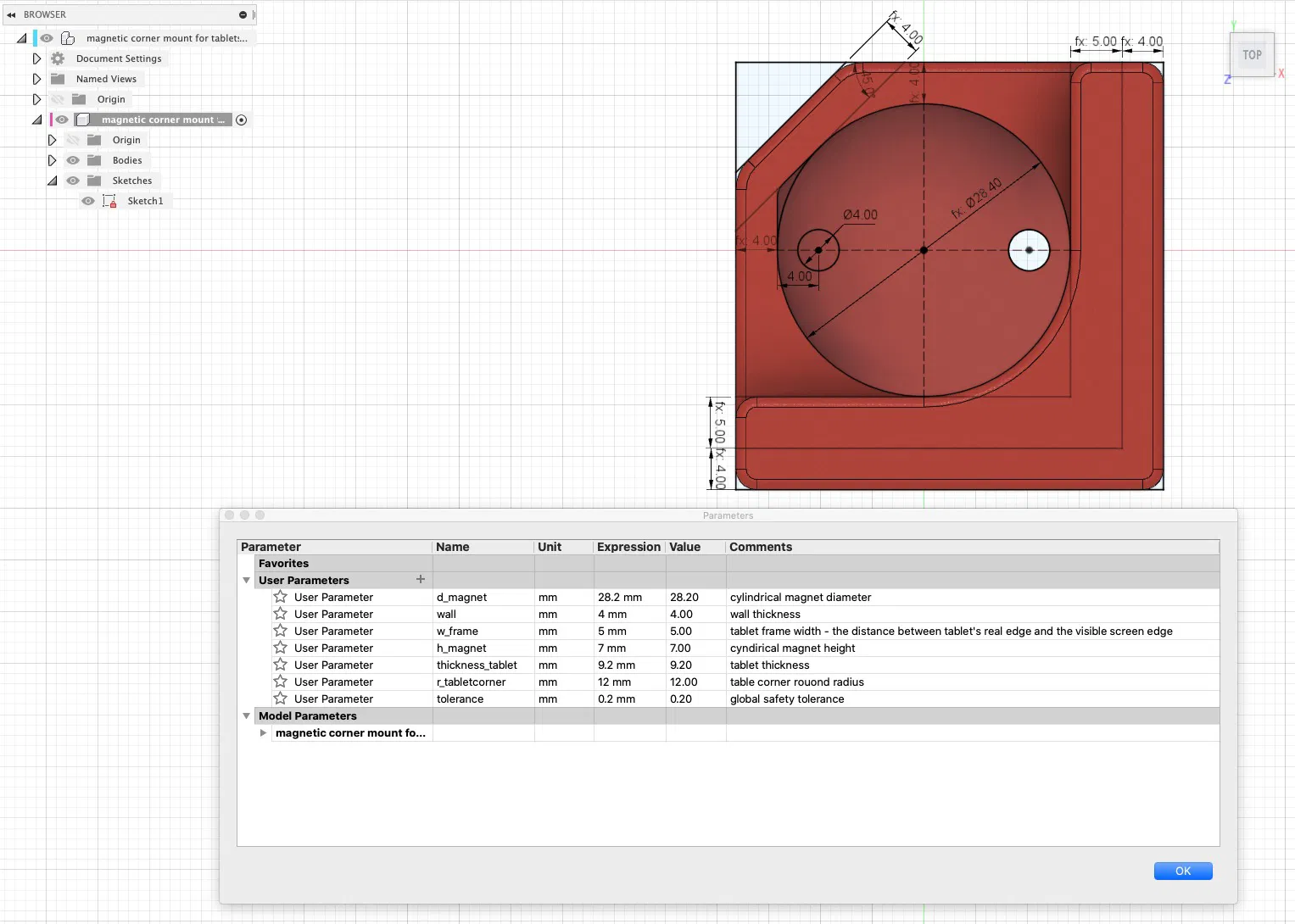 Thiết kế giá đỡ góc tối giản, tùy chỉnh tham số để gắn máy tính bảng lên tủ lạnh. File STL phù hợp iPad Pro 9.7" kèm ốp lưng silicon, bạn có thể tùy chỉnh các thông số như độ dày, độ cong góc, viền máy, đường kính và chiều cao nam châm. Đã có file Fusion 360.