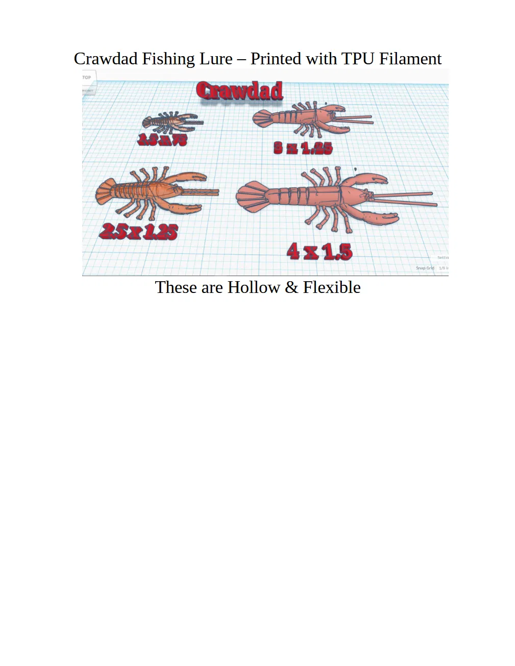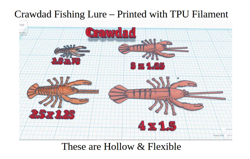 Mô hình mồi tôm càng xanh mềm có thể in 3D, với 4 kích cỡ khác nhau. Bạn có thể tùy chỉnh thêm lưỡi câu, đầu jig và mồi nhử. Tối ưu hóa cho in bằng TPU, thời gian in khoảng 23 phút cho một bộ. Chia sẻ kinh nghiệm in và câu cá của bạn!