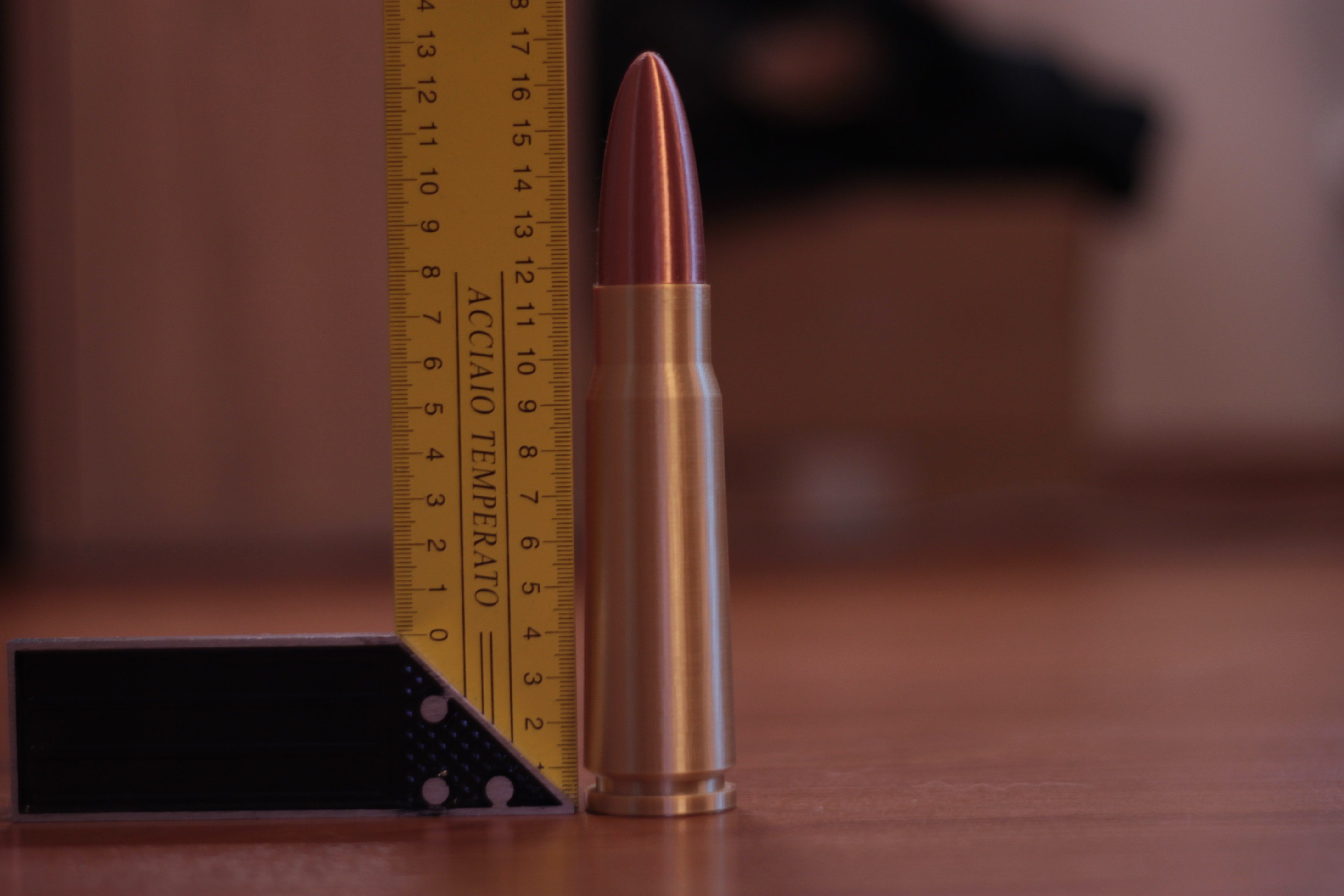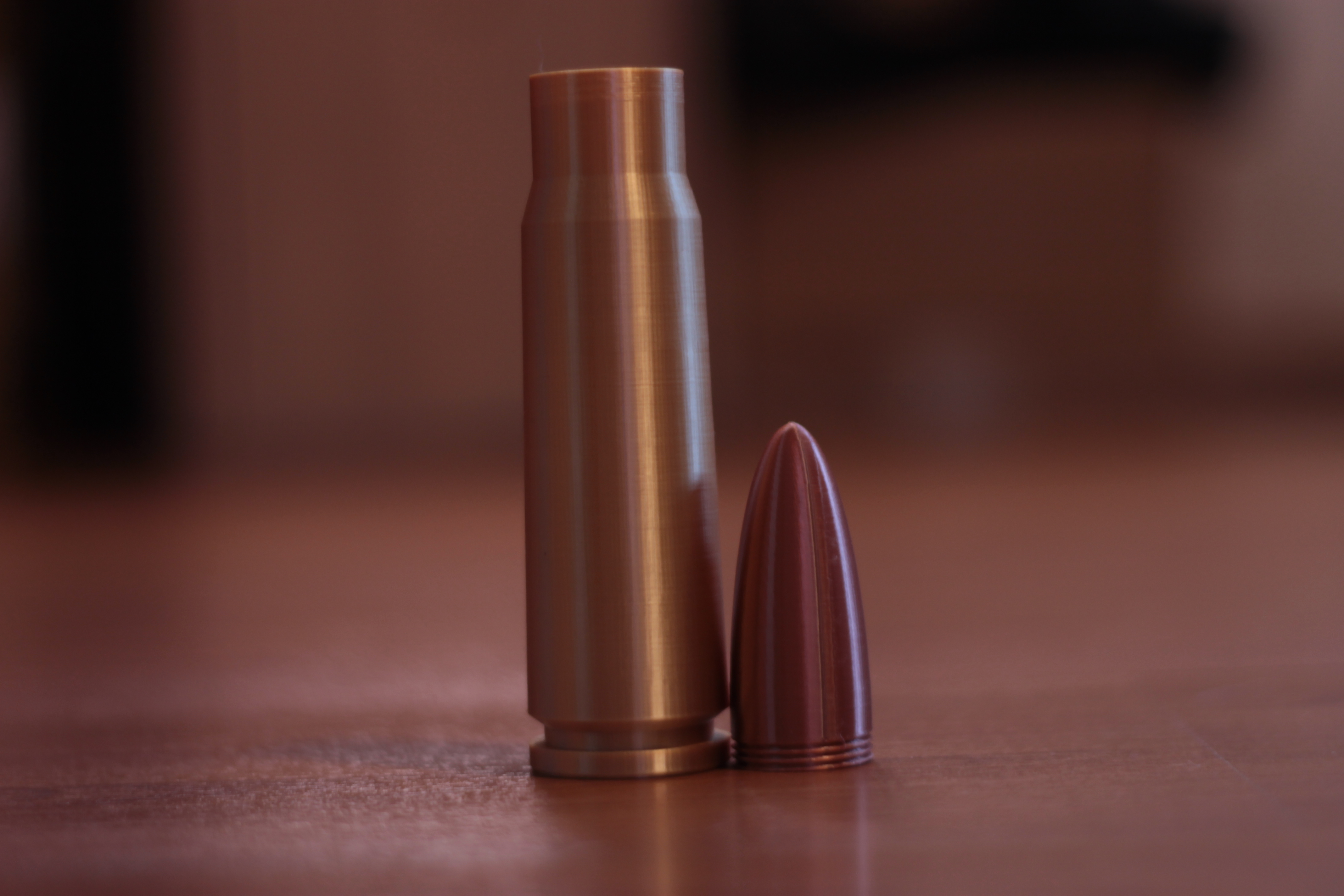 Bản sao viên đạn 7,62 x 39 (sử dụng trong AK-47) tỉ lệ 3:1. Tôi đã làm nó thành cái hộp có nắp vặn. Tôi in nó bằng PLA lụa với độ dày lớp 0,12mm. Trong file gốc, bạn có thể tìm thấy kích thước thật của viên đạn.