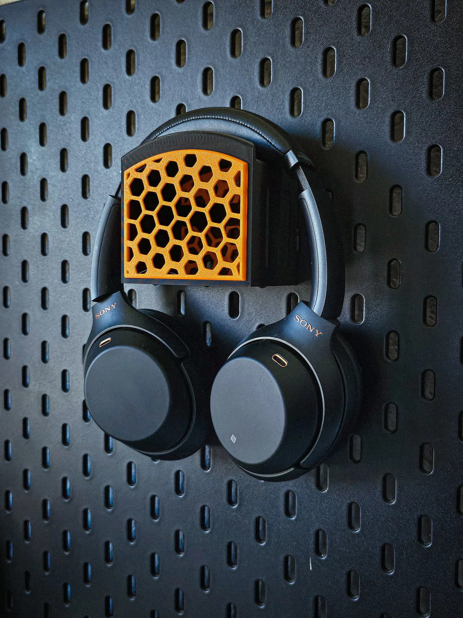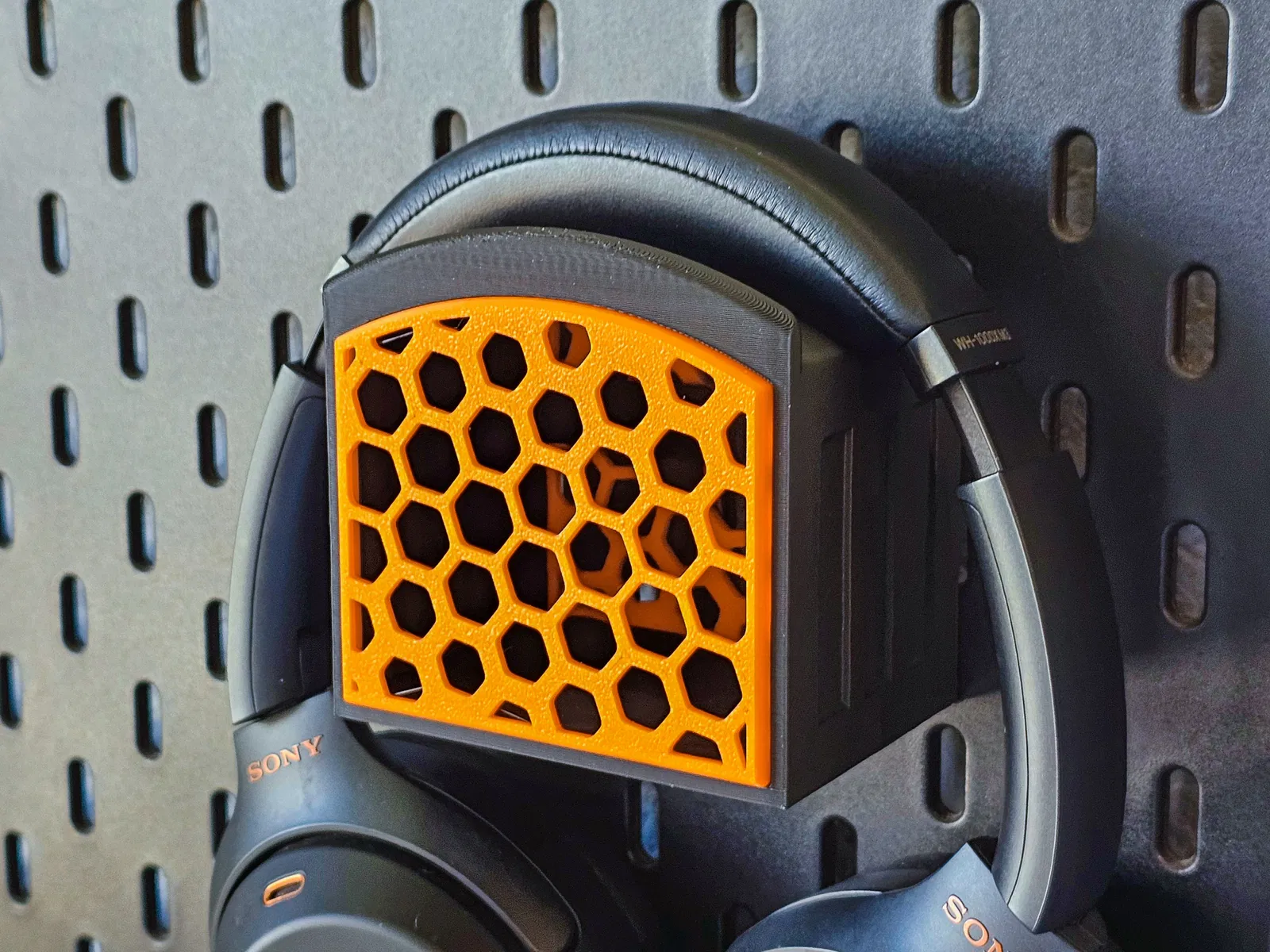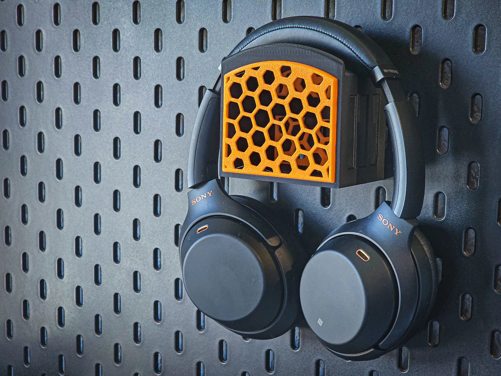 Giá đỡ tai nghe có thiết kế hiện đại, gắn lên bảng IKEA Skådis hoặc treo tường với các tấm nhấn nhá có thể thay đổi. Dễ dàng tùy chỉnh màu sắc, không cần AMS, có thể dùng làm kệ để đồ nhỏ. Bản in đế ở góc 45 độ, có hỗ trợ thêm cho các lớp in. Cập nhật thêm profile gắn bằng vít 3mm hoặc command strips.