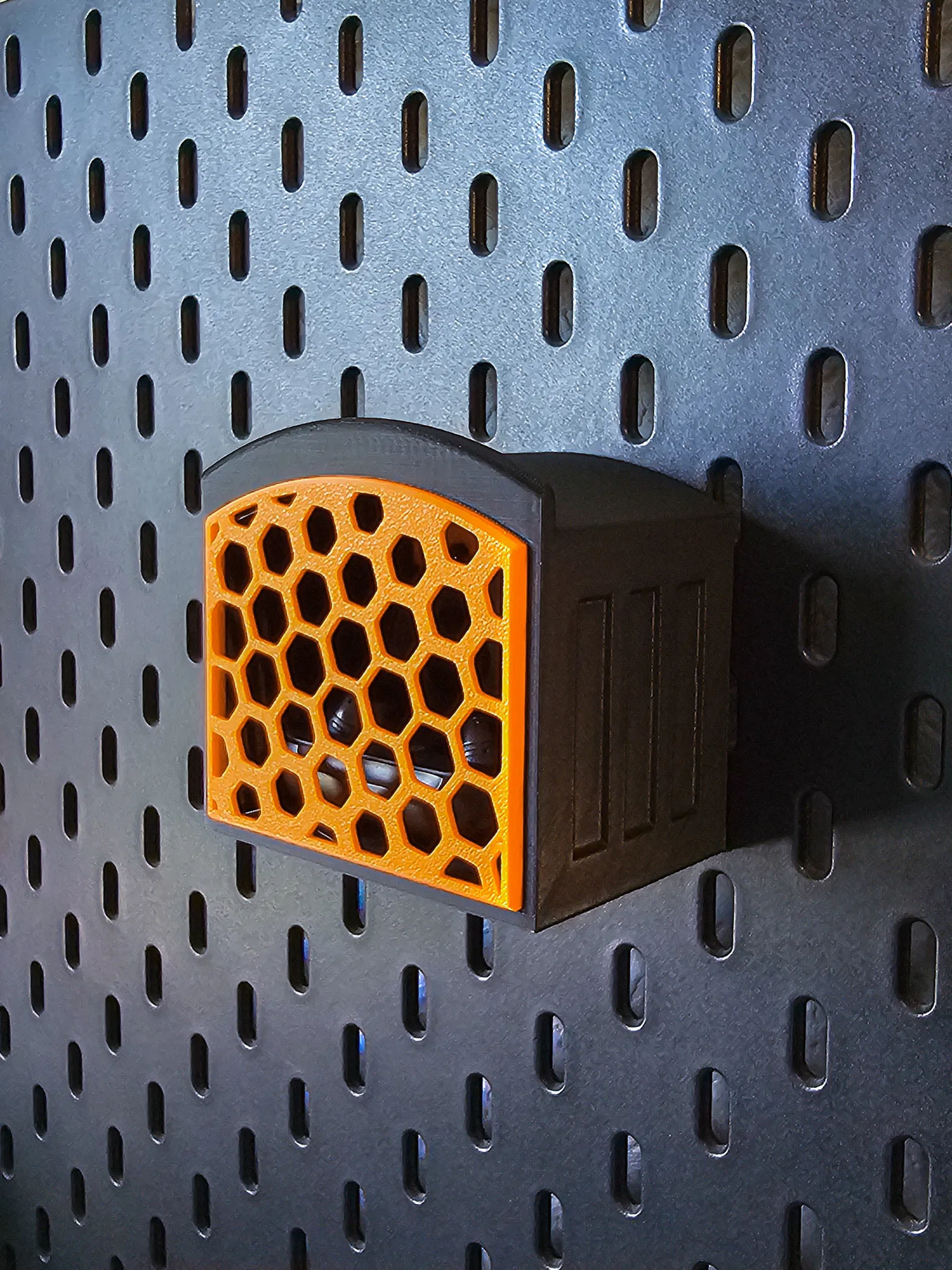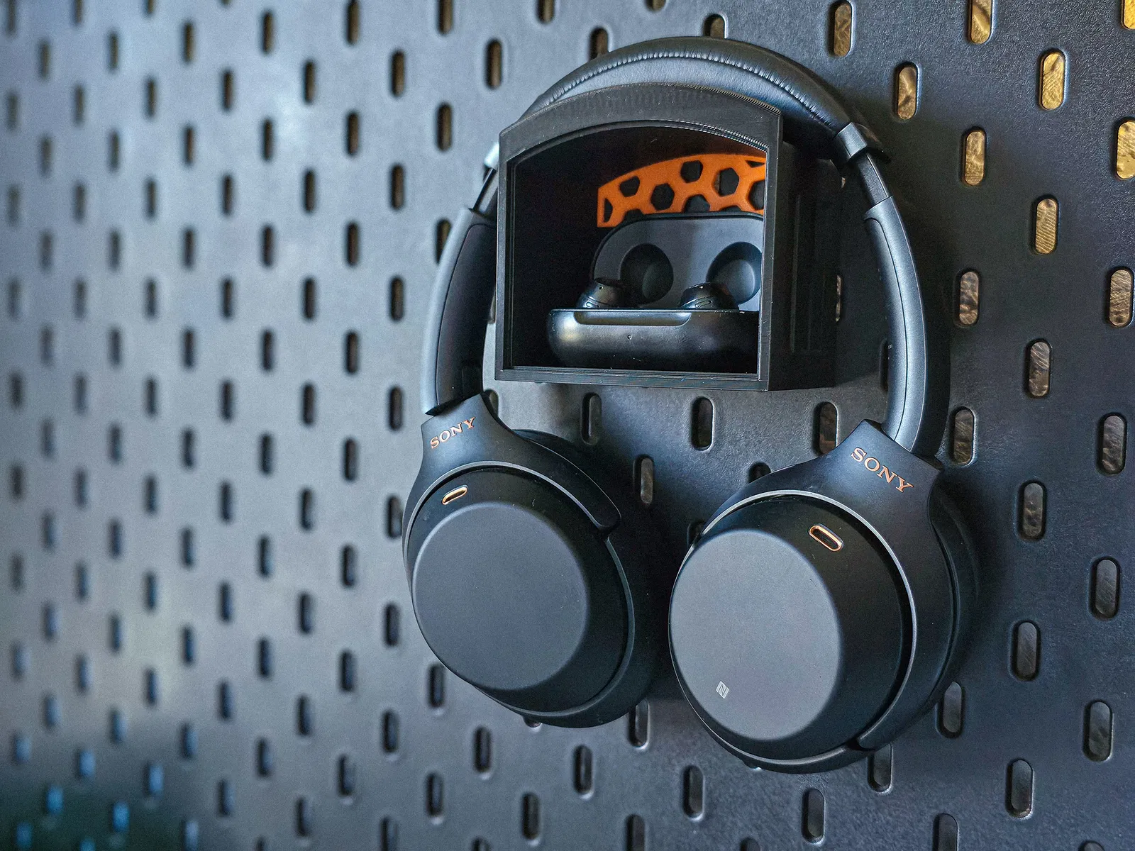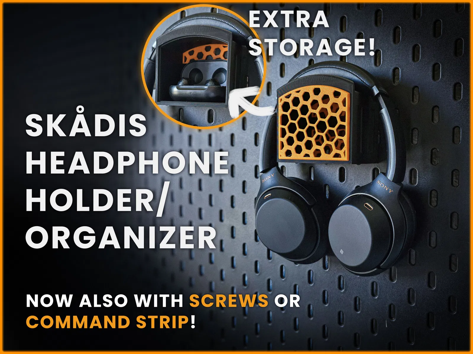 Giá đỡ tai nghe có thiết kế hiện đại, gắn lên bảng IKEA Skådis hoặc treo tường với các tấm nhấn nhá có thể thay đổi. Dễ dàng tùy chỉnh màu sắc, không cần AMS, có thể dùng làm kệ để đồ nhỏ. Bản in đế ở góc 45 độ, có hỗ trợ thêm cho các lớp in. Cập nhật thêm profile gắn bằng vít 3mm hoặc command strips.