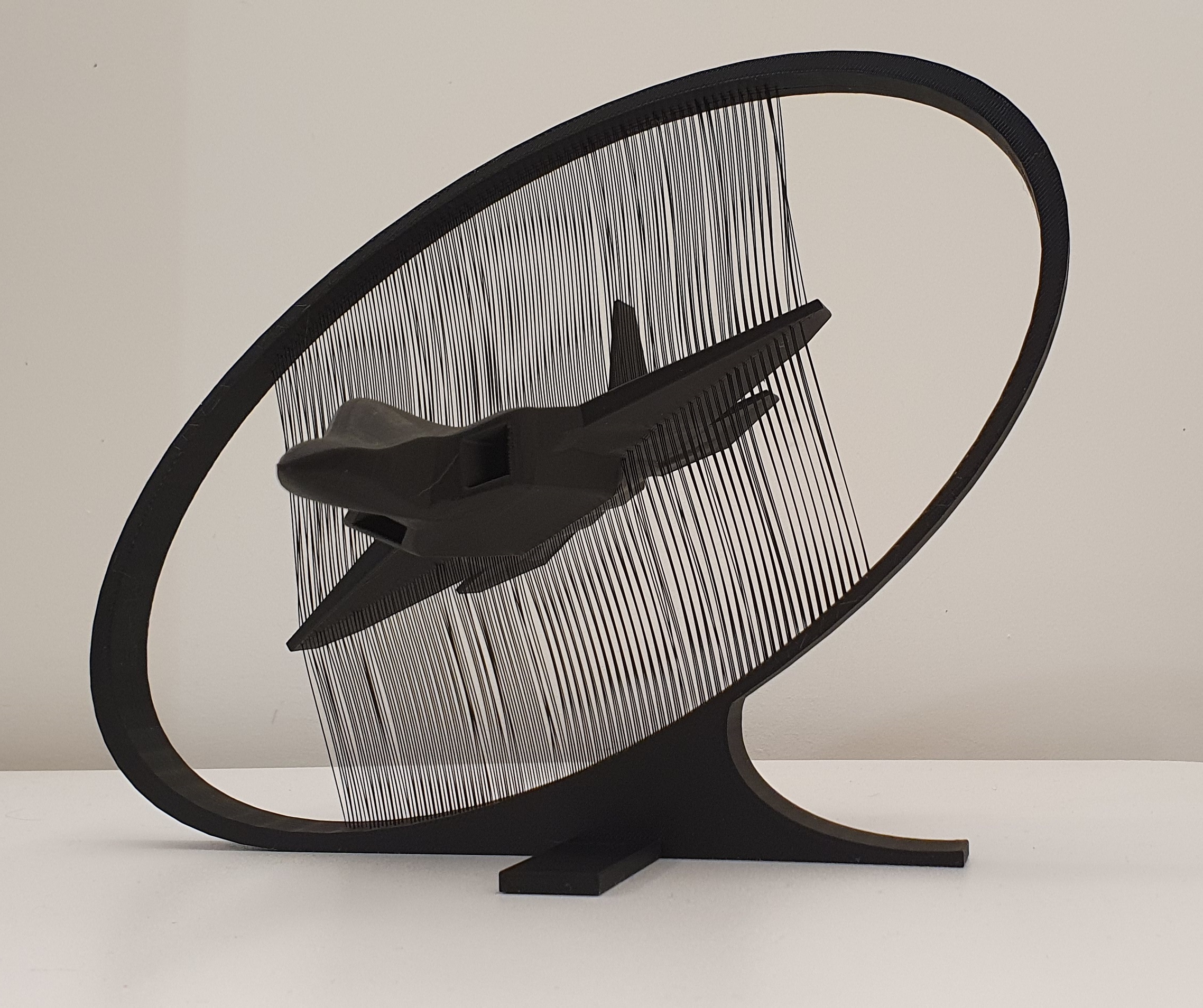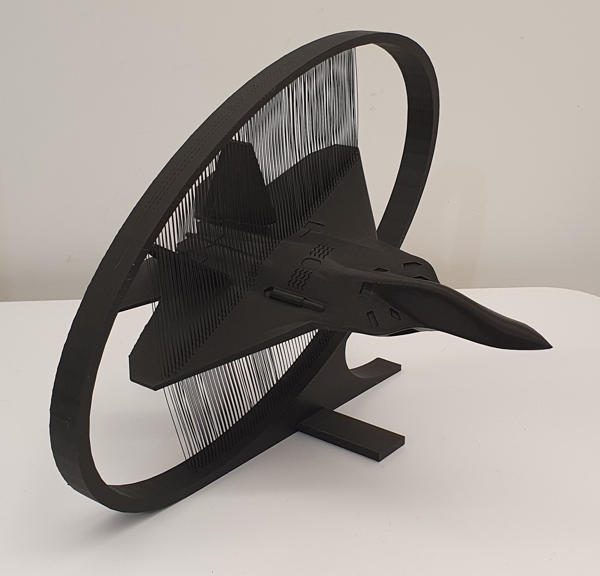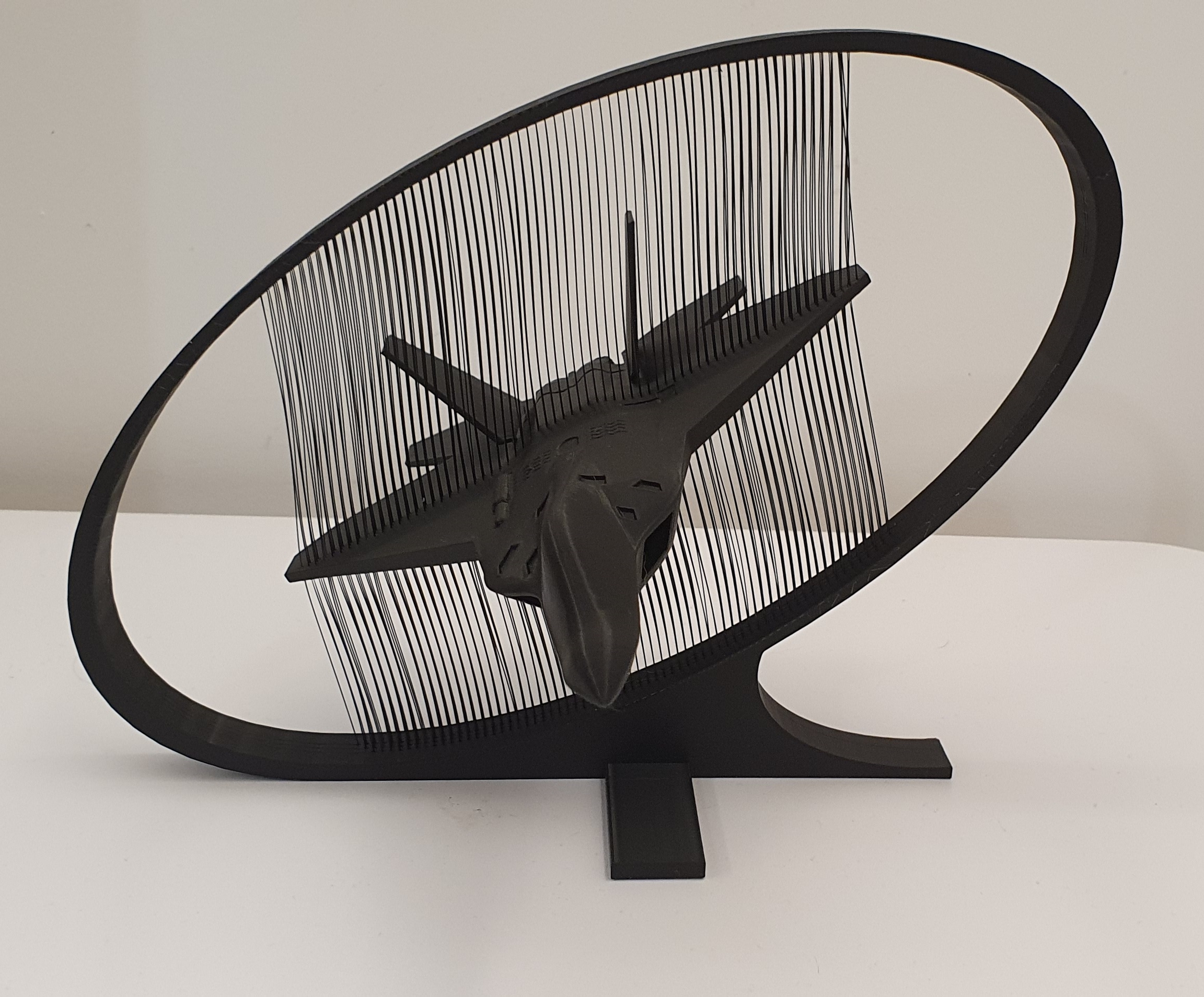 Mô hình có màn hình nghệ thuật dây (string art) mô phỏng một cách khéo léo hình ảnh máy bay đang bay, tạo ảo giác F-22 đang bay lượn trên bầu trời.