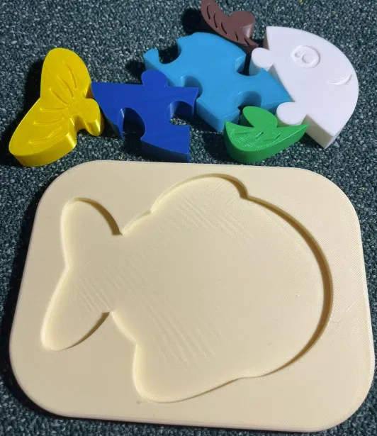 Puzzle chèn hình con cá cho bé và trẻ tập đi. Mấy miếng ghép khớp với nhau đẹp và đơn giản, có thể dùng để trang trí hoặc chơi đùa, giúp bé phát triển kỹ năng vận động và nhận biết hình dạng.