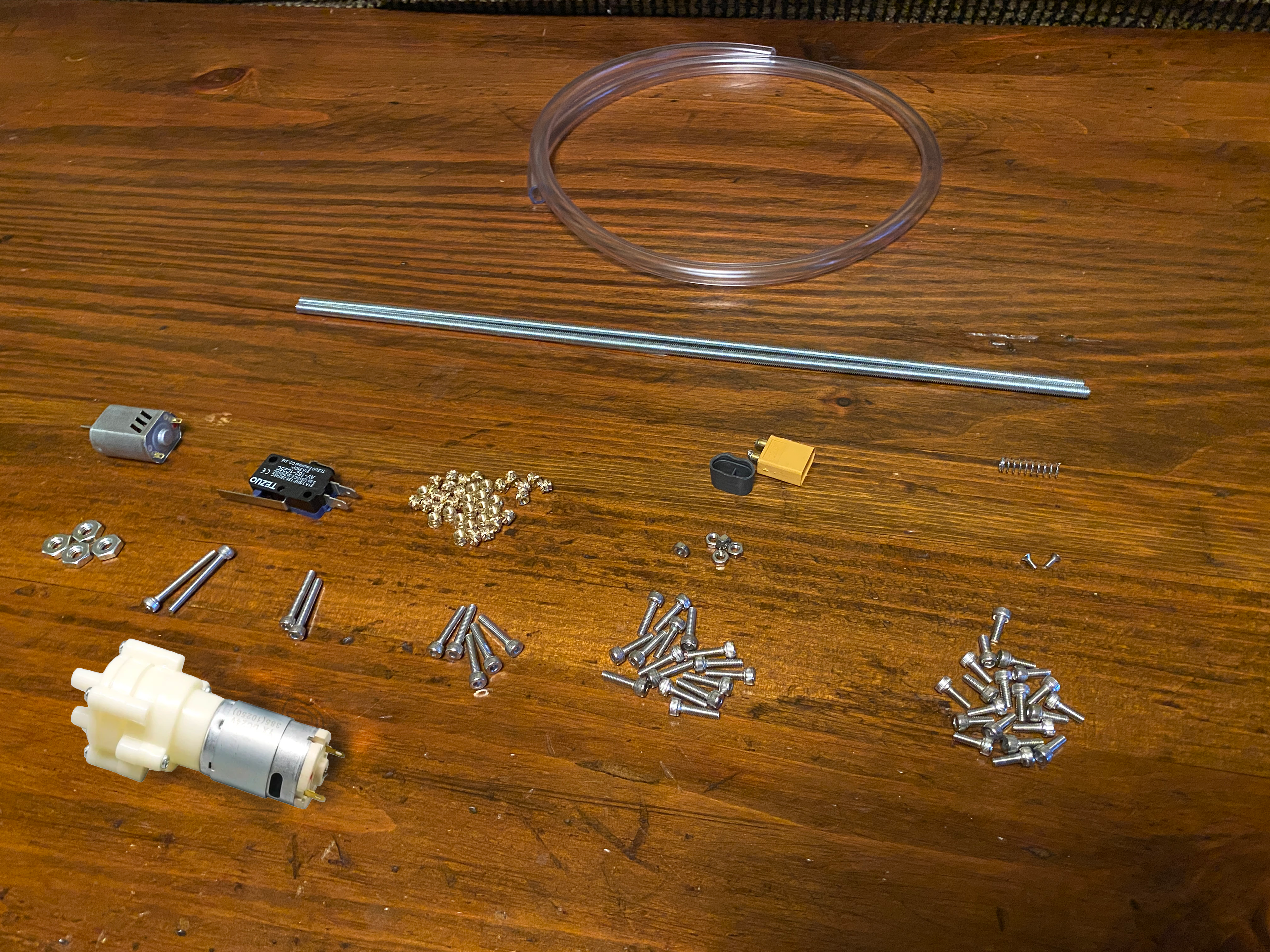 Phần cứng: Phần cứng có sẵn để mua trên Etsy của tôi: https://www.etsy.com/listing/1731312092 Nếu bạn muốn tự tìm nguồn cung ứng, đây là danh sách phần cứng cần thiết 20x ốc M3 8mm 16x ốc M3 12mm 5x ốc M3 16mm 2x ốc M3 20mm (Có thể) 2x ốc M3 25mm 37x Vòng đệm đồng M3 5x Đai ốc lục giác M3 2x ốc động cơ 1x Động cơ Kraken của Out of Darts 1x Công tắc Omron (hoặc bản sao) 21amp 1x Đầu nối XT-60 đực 1x Lò xo cò súng (lò xo nén nhỏ) 1x Bơm màng R385 Khoảng 25 inch ống mềm 1/4-inch ID 3/8-inch OD 4x Đai ốc lục giác 10-32 2x Thanh ren dài 13 inch, 10-32 (Thanh ren Caliburn) Một ít dây silicon 18 gauge Một ít ống co nhiệt Keo nóng Keo siêu dính Khóa ren Pin Lipo 2s phù hợp với kích thước 100x40x16mm