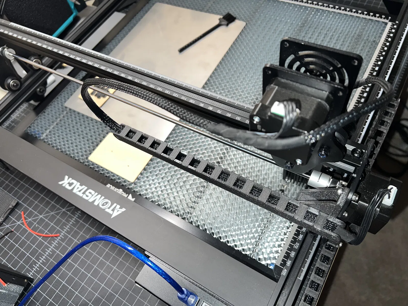 Giải pháp quản lý cáp hiệu quả cho máy laser Atomstack A5, giúp dây cáp gọn gàng và linh hoạt hơn. Dễ dàng lắp đặt với các mắt xích và kẹp được cải tiến. Phiên bản này cung cấp sự mềm dẻo và độ bền cao, phù hợp cho cả trục X và Y.
