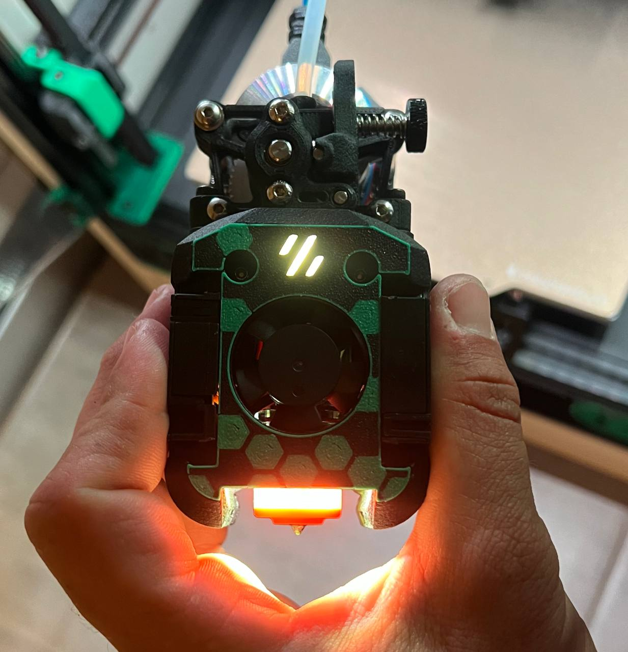 Sau khi lắp thêm một bộ đầu phun và gắn đèn LED, tui nhận ra là vì lý do nào đó mà tui đã làm đầy mất khe đèn logo. Giờ nó đã được thêm vào và tui khuyên bạn nên in logo bằng sợi màu trắng hoặc có thể là màu trong suốt để hoạt động như bộ khuếch tán (thêm một lần đổi màu nữa nè).