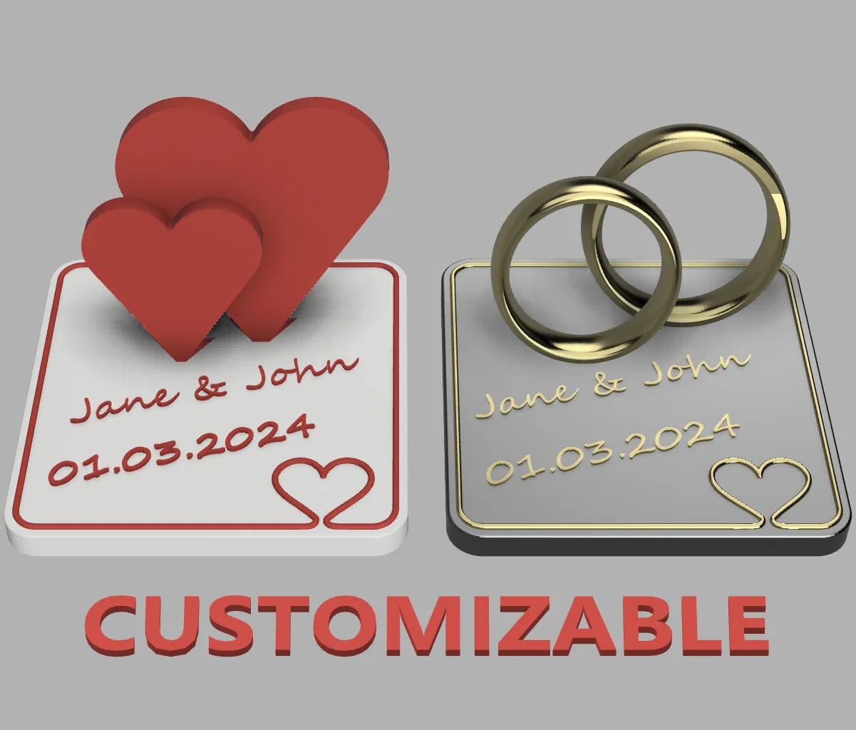 In món quà cưới thật xinh xắn chỉ với một lần đổi màu dây tóc! Mô hình 2 kiểu tùy chỉnh tên và ngày, kích thước khoảng 10x10cm, không cần AMS hay MMU. Hướng dẫn chi tiết cách cá nhân hóa và in ấn.