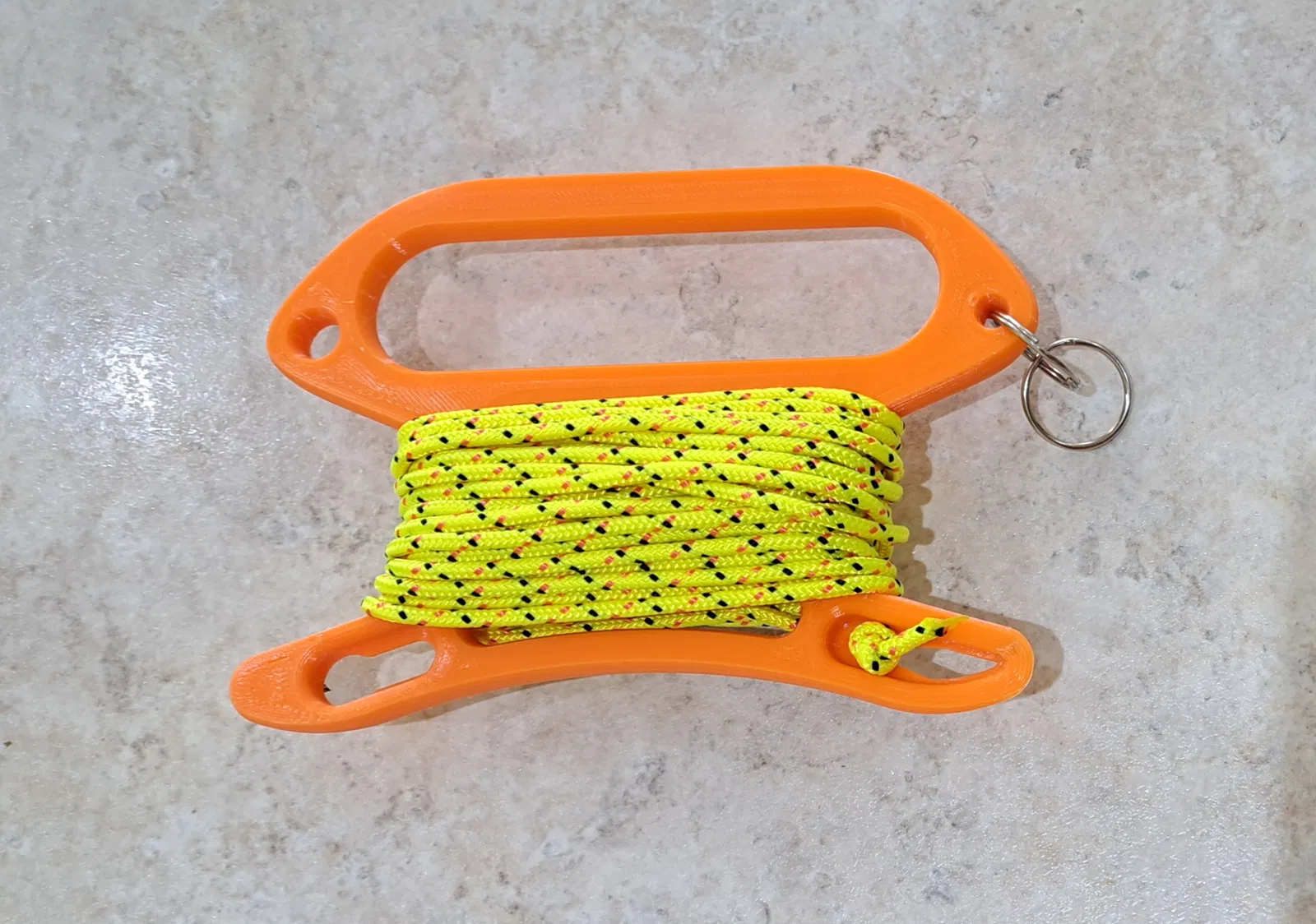 Tui thiết kế cái dụng cụ quấn dây paracord này có thêm mấy cái lỗ trên tay cầm để gắn vô ba lô khi đi hiking hoặc cắm trại, nhờ vậy mà lúc nào cũng có sẵn dây paracord dự phòng khi cần.