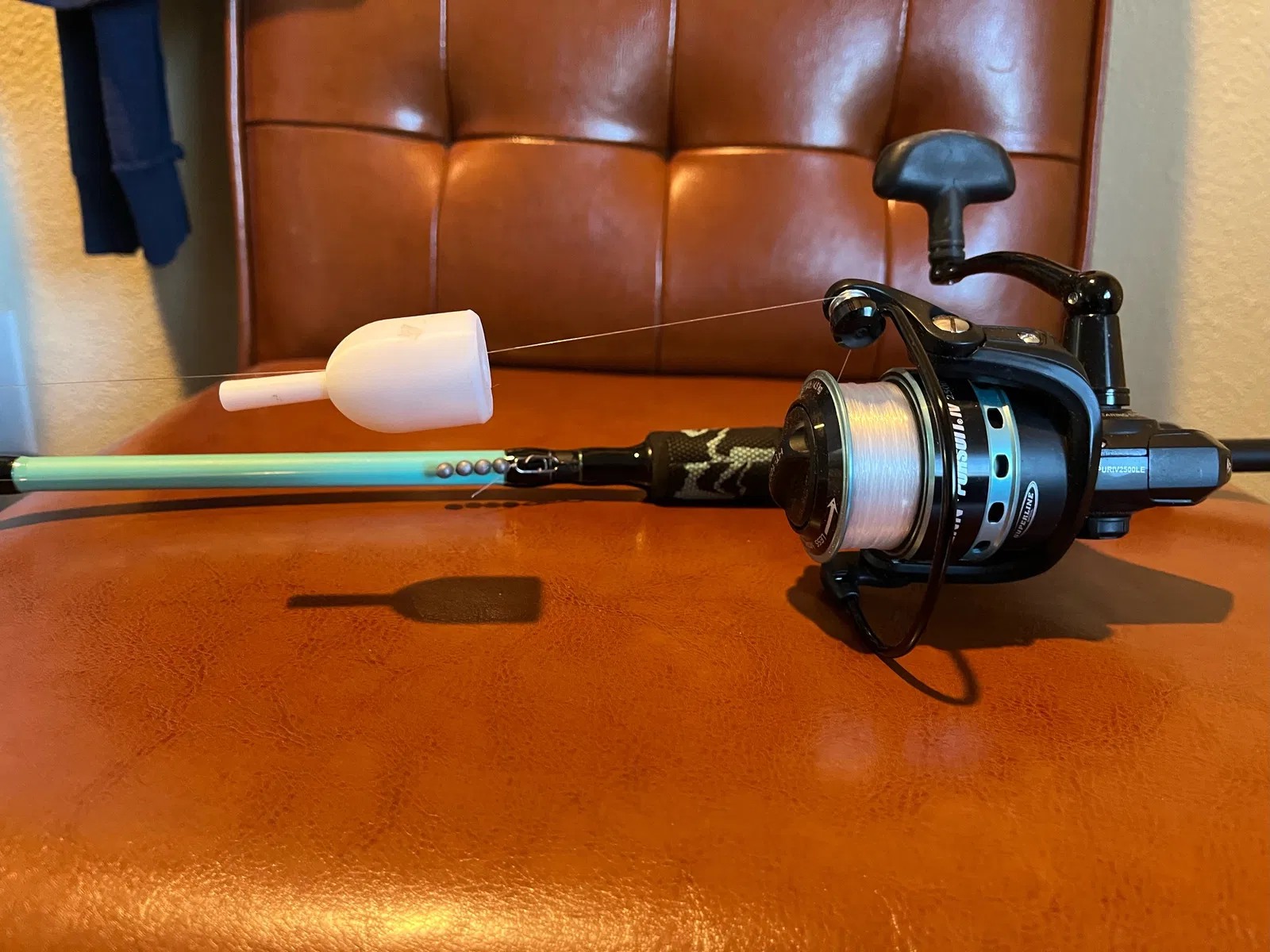 Đây là một cái phao câu cá mà tui đã thiết kế. Nó có một cái rãnh ở bên hông để có thể đặt lên dây cước ở trên một bộ đồ câu có sẵn thay vì phải luồn dây qua. Chỉ cần luồn dây vào rãnh rồi nhét cái chốt vào lỗ để giữ nó cố định.