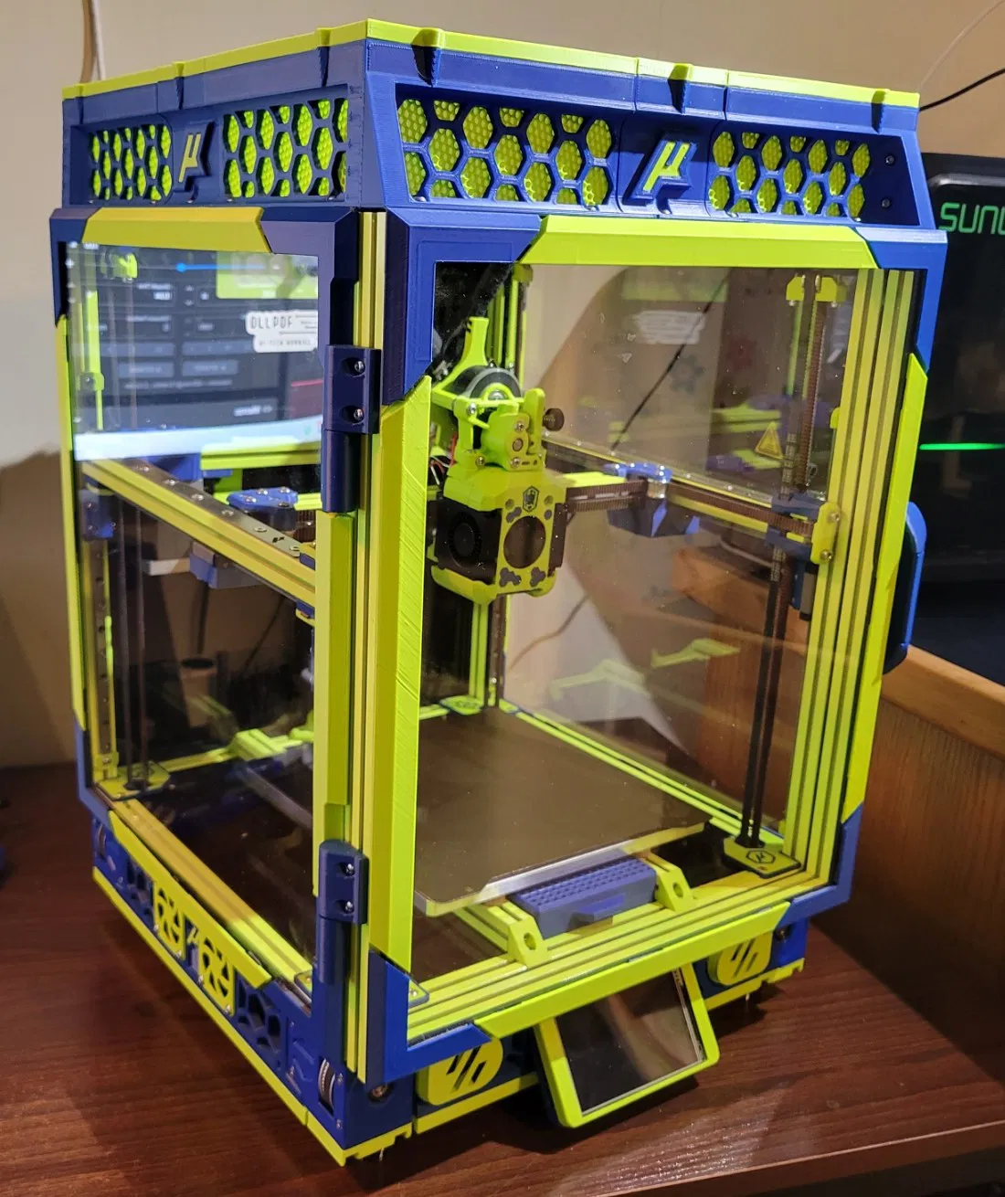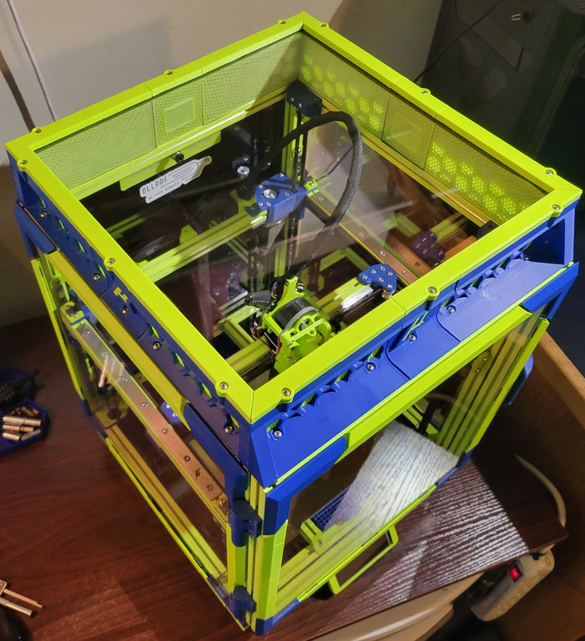 Các bộ phận đã được đặt đúng hướng và có hỗ trợ khi cần thiết. Tôi đã in chúng với 3 lớp tường, 5 lớp đáy, 4 lớp trên cùng và 25% honeycomb để có được hiệu ứng như bạn thấy trong ảnh. Tôi đã sử dụng ABS trong suốt cho 5 lớp đầu tiên để ánh sáng có thể xuyên qua, nhưng vẫn đảm bảo khoang kín. Việc thêm NDN cần thiết khá đơn giản bằng cách nới lỏng các thanh ray trên cùng và các bộ phận giữ trục Z khi cần để trượt chúng vào.