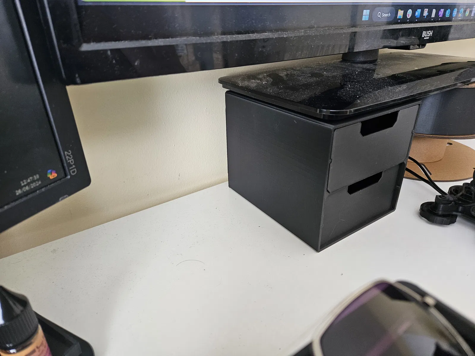 Đây là bản đầu tiên nha, nên giờ chưa có cách nào ghép mấy bộ hộc kéo lại với nhau đâu, tui đang xài 2 bộ thôi, ở giữa còn hở, bộ thứ hai đang in nè, xong tui lắp vô xài dưới màn hình liền.
