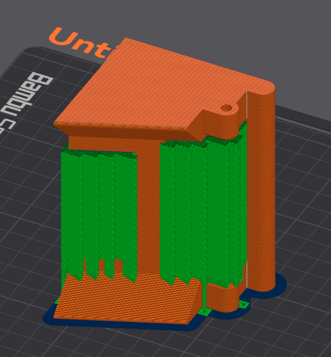 - Orientation: Cái mặt này phải úp xuống mâm in nha. Như vậy thì mấy cái lỗ tròn nó mới đẹp và cái lỗ cho thanh rod nó mới chắc, chịu lực tốt. In kiểu khác là dễ bị nứt lắm đó (coi hình nha).