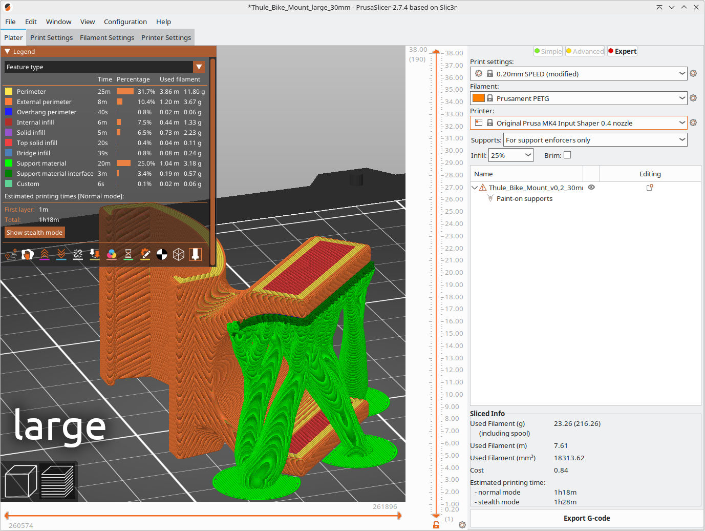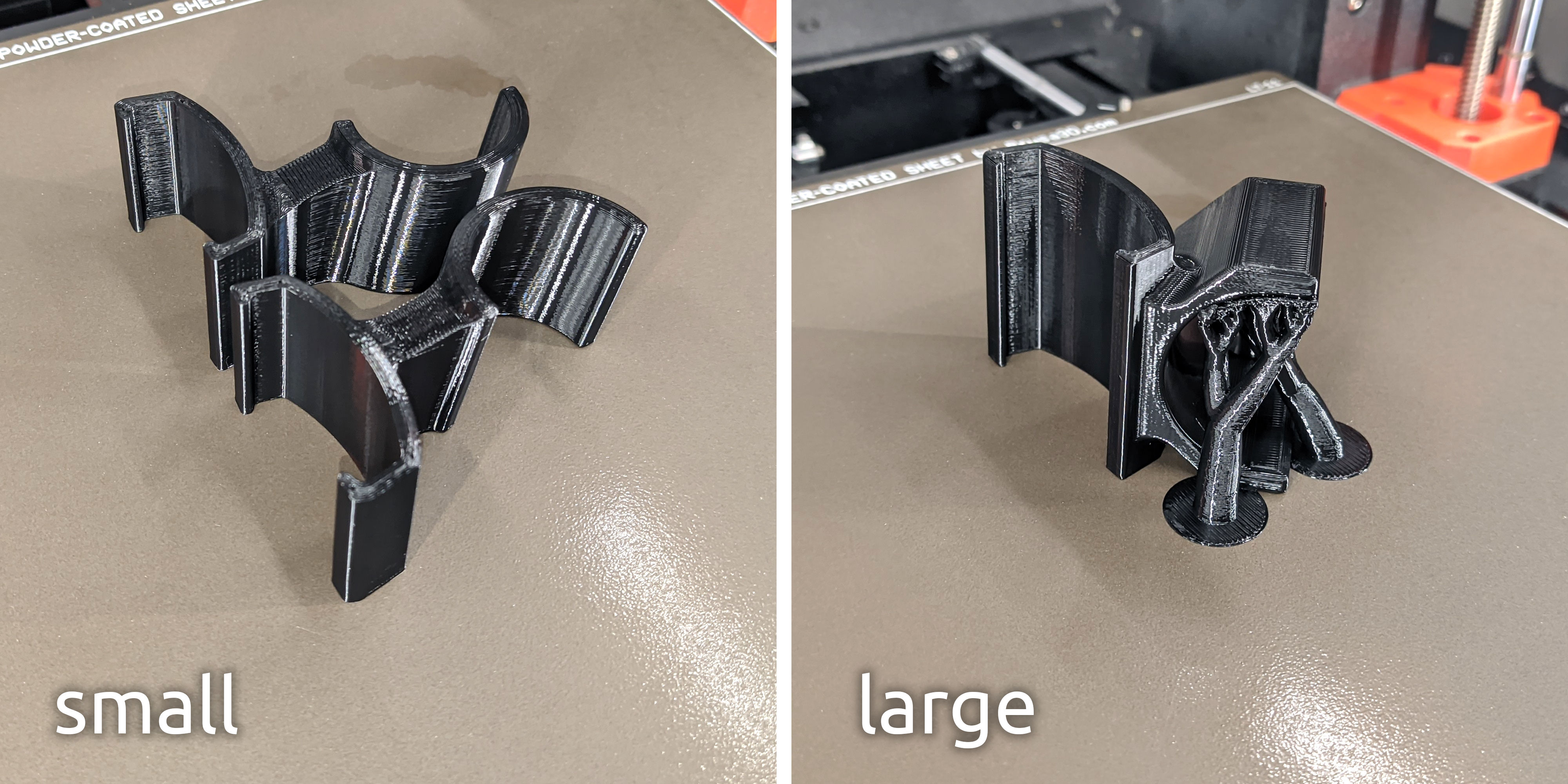 Cả hai mẫu nên in bằng PETG với preset cấu trúc 0,2mm, 5 lớp ngoại vi (ABS, ASA hoặc PA/Nylon cũng xài được). Chỉ cần support cho mẫu lớn như chỉ.