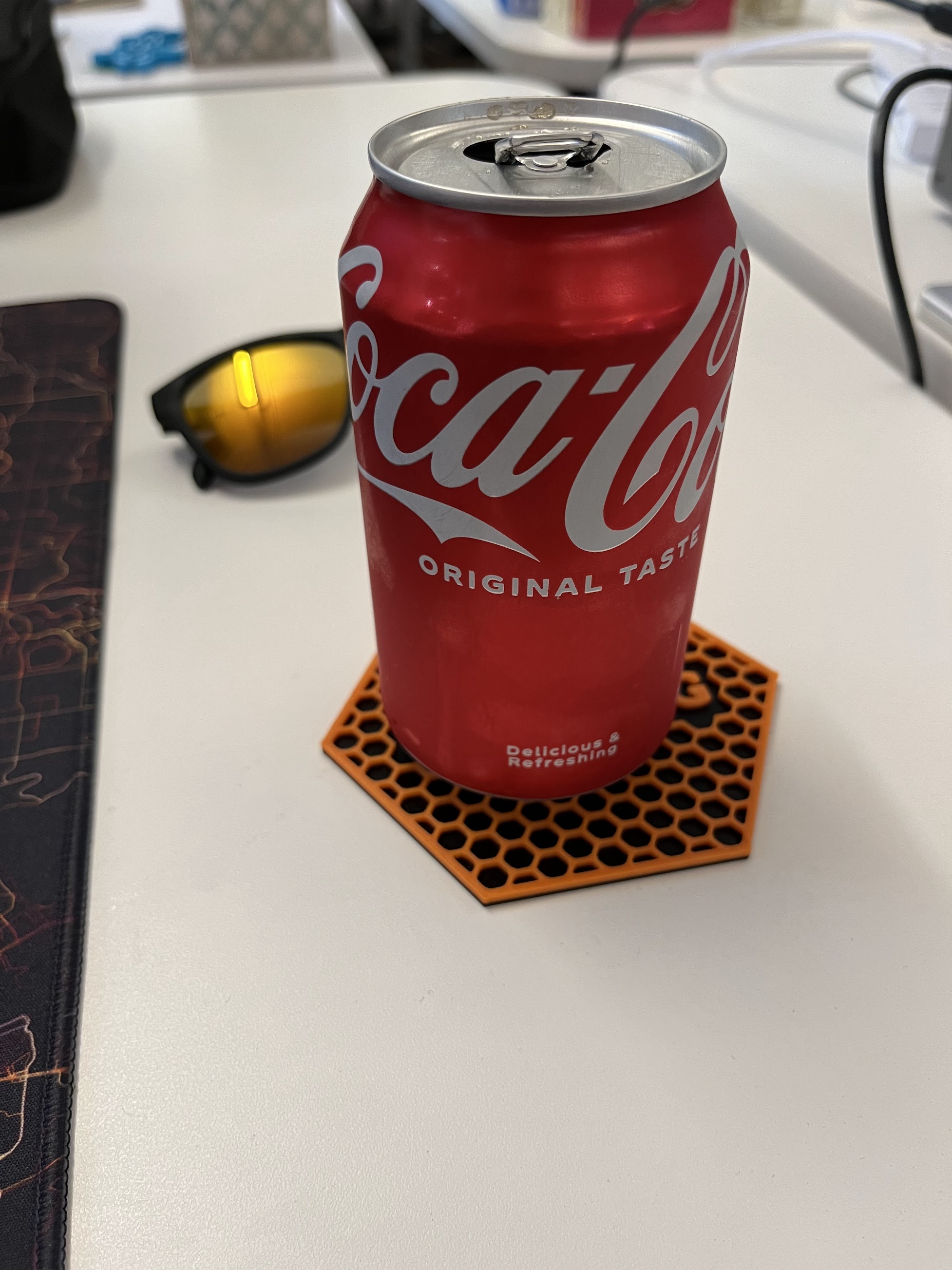 Đế lót ly hình lục giác tùy chỉnh, có cạnh cao để hứng nước và bề mặt chống trượt. Có thể thêm chữ hoặc tùy chỉnh kích thước, số lượng hình lục giác. Hướng dẫn chi tiết cách thêm chữ bằng Prusa Slicer và OpenSCAD. Mã nguồn có trên GitHub.