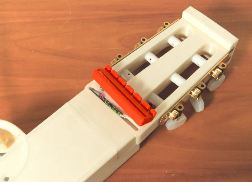 Tuy nhiên, tôi vẫn bao gồm một đai ốc và một lược đàn trong thiết kế. Động lực là "nhựa" là một thuật ngữ rất chung chung. Có nhiều loại polyme tổng hợp, với các đặc tính khác nhau, tất cả đều được gọi là "nhựa" (thực tế, TUSQ cũng là một polyme tổng hợp). Khi bạn chọn in đai ốc và lược đàn, tôi khuyên dùng PLA hơn PETG, xem xét độ cứng của vật liệu; và rõ ràng là tôi khuyên dùng điền đầy 100%.