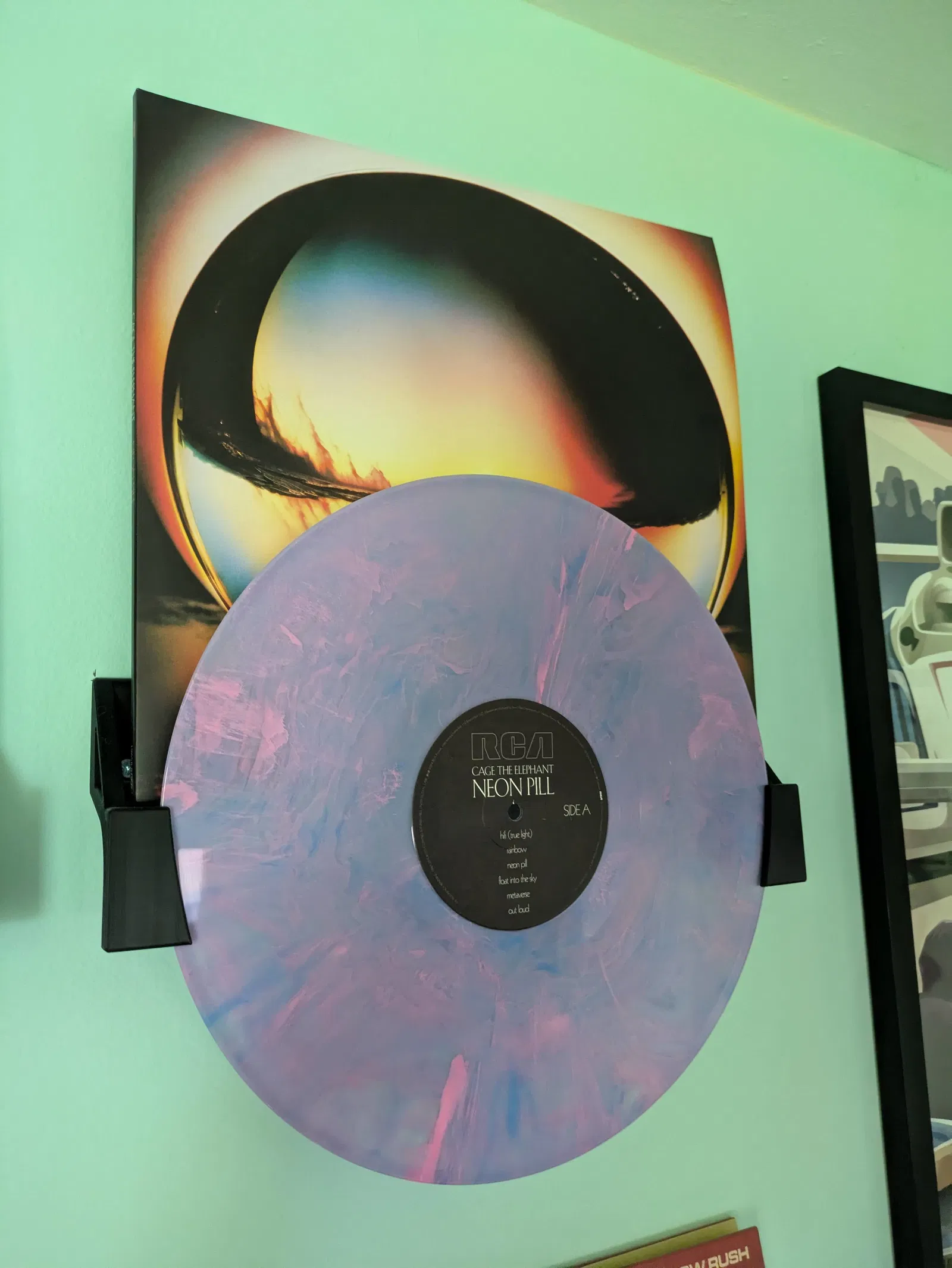 Móc treo đĩa vinyl lên tường, vừa trưng bày được đĩa nhạc vừa khoe được bìa album "xịn sò". Sản phẩm này được in bằng PLA với 15% infill, khoảng cách treo trái phải lý tưởng là 13 1/8 inch.