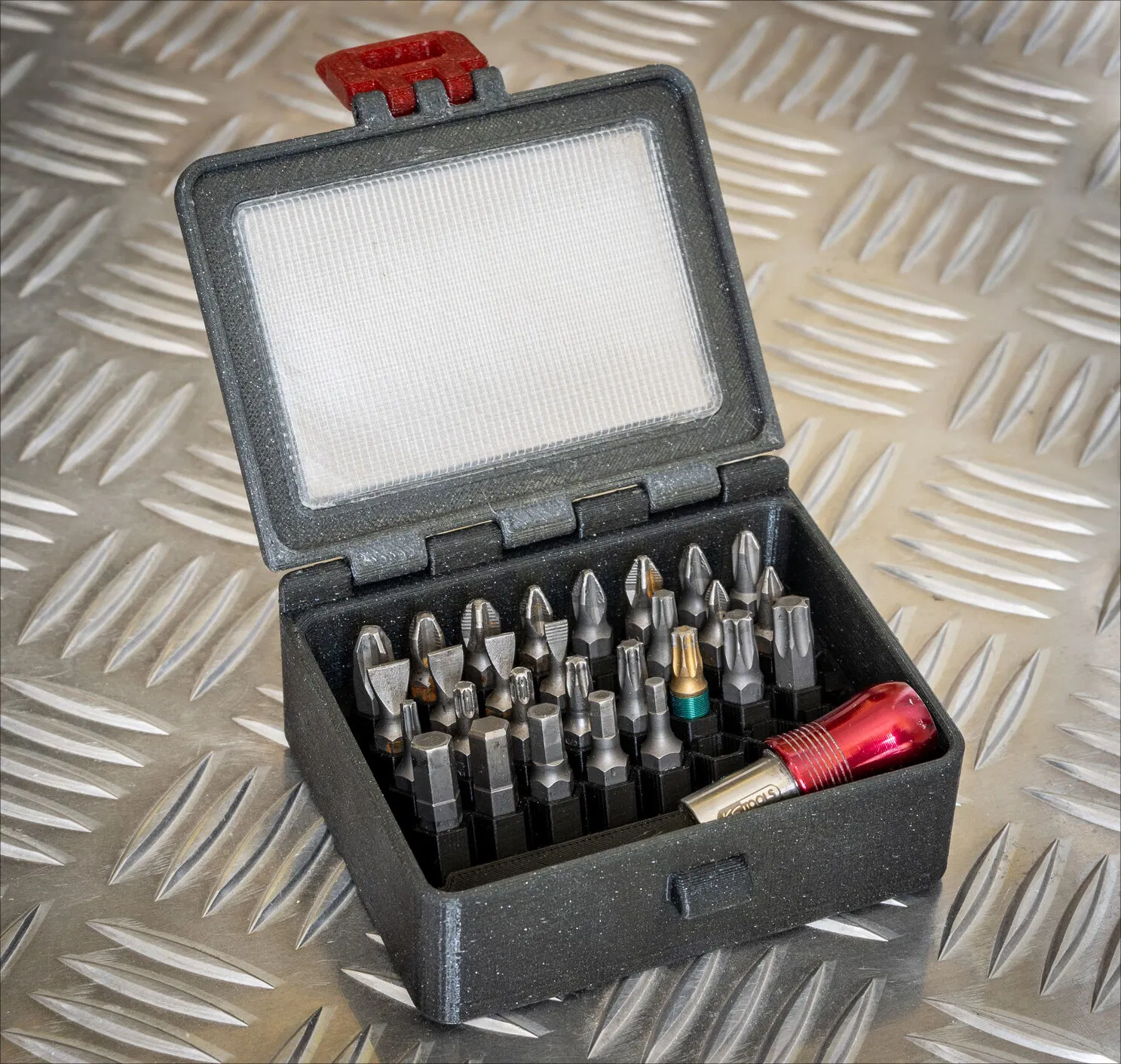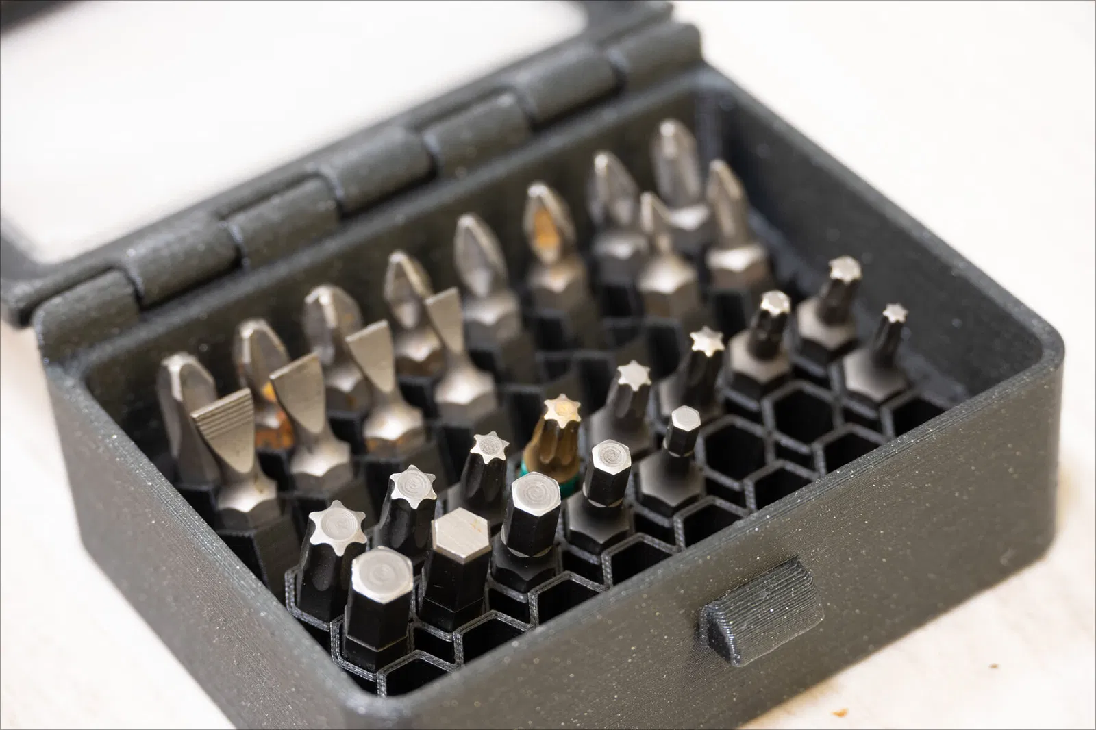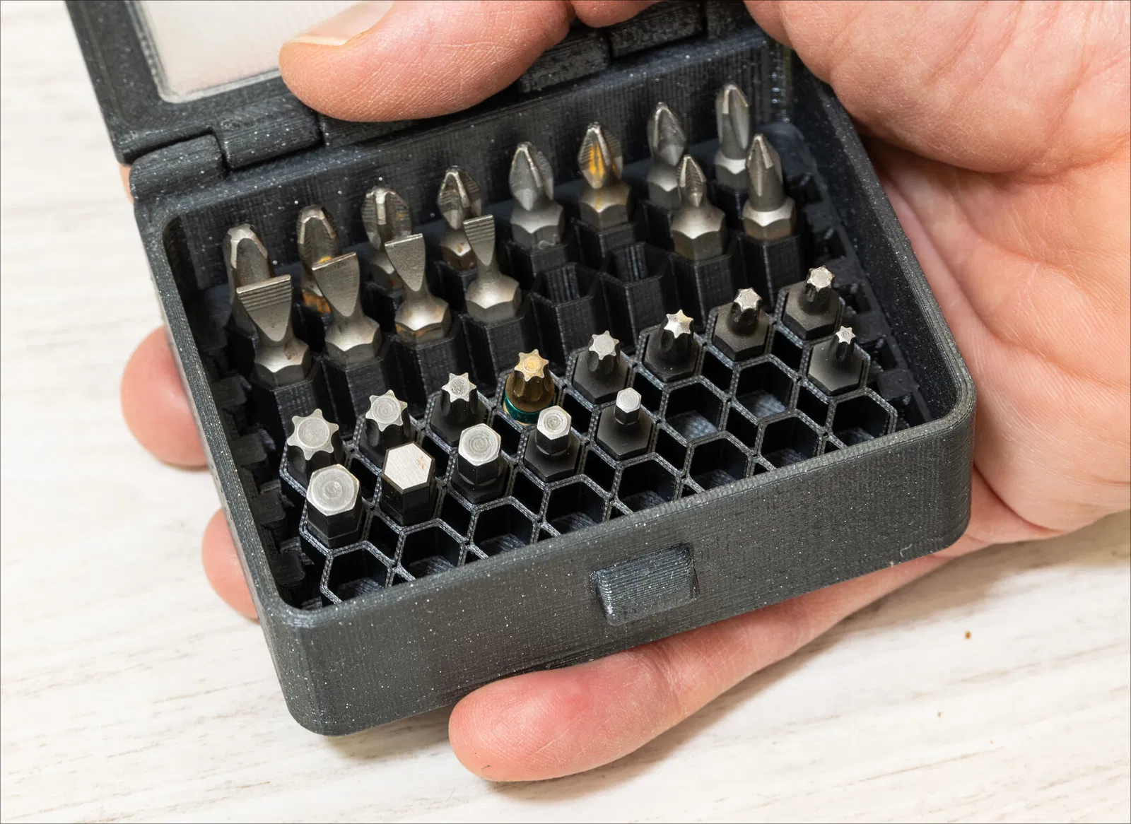 Giá đỡ mũi khoan cho hộp parametric, dễ dàng tháo lắp, chứa được tới 40 mũi khoan. Cần tùy chỉnh kích thước hộp bên trong và in thêm các khay. Hoàn hảo để sắp xếp dụng cụ.