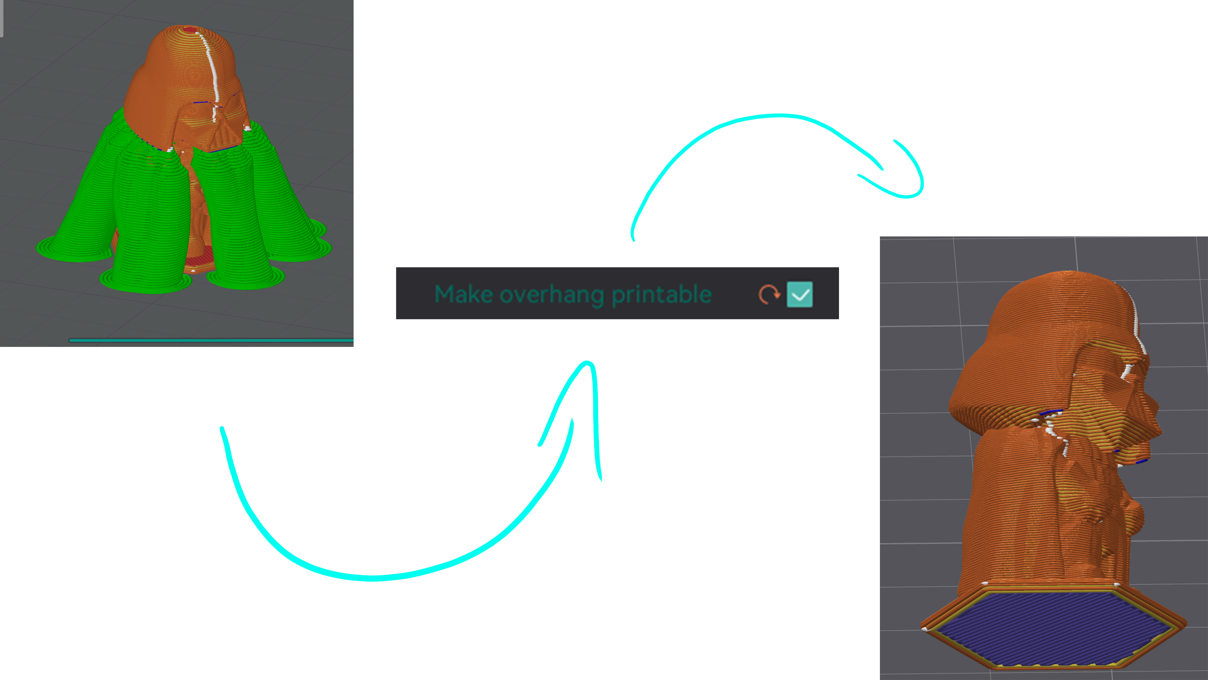 Anh em có thể in mà không cần support, bằng cách dùng chức năng MAKE OVERHANG PRINTABLE trong slicer, giống như Orca Slicer của tui nè
