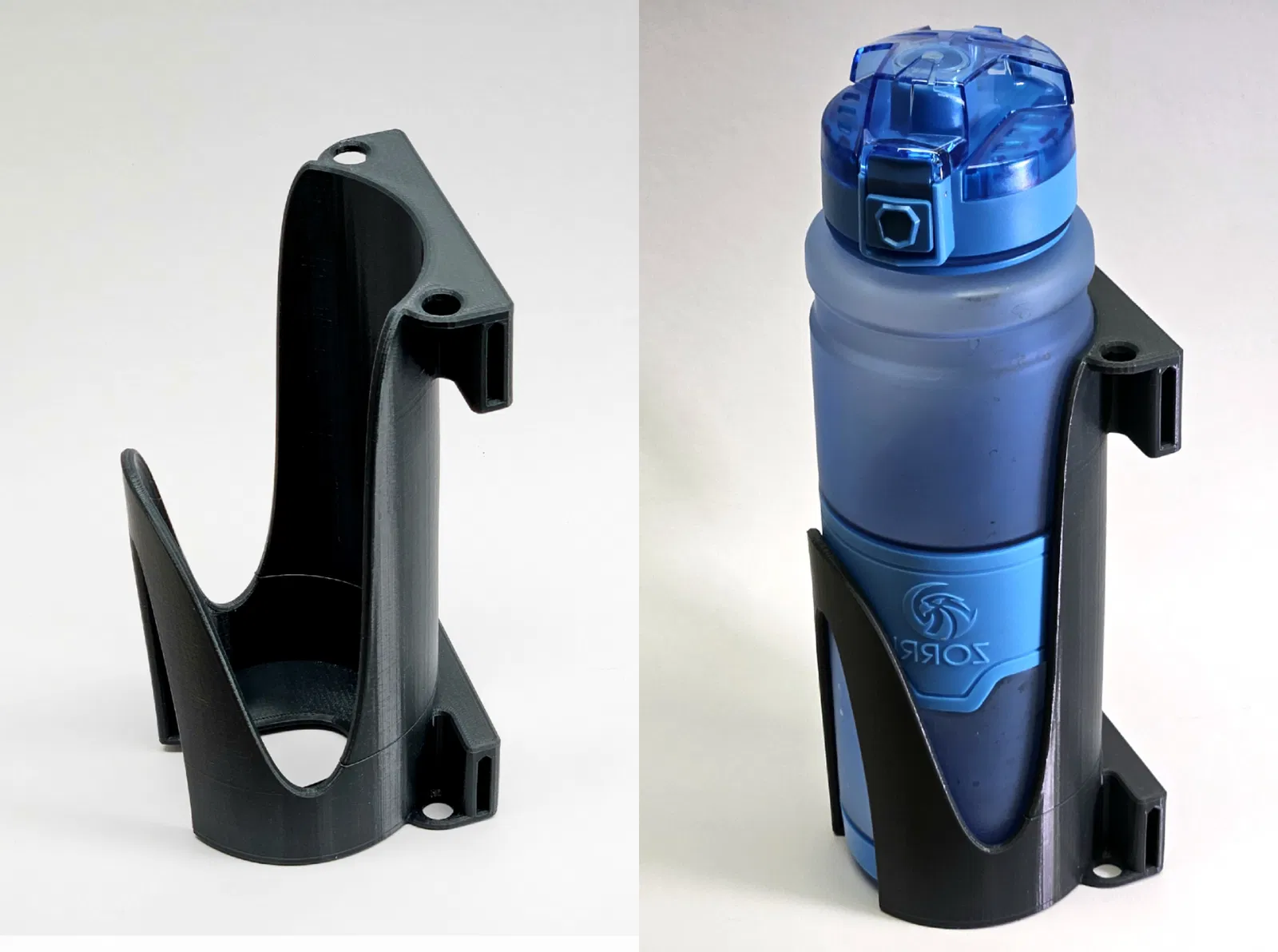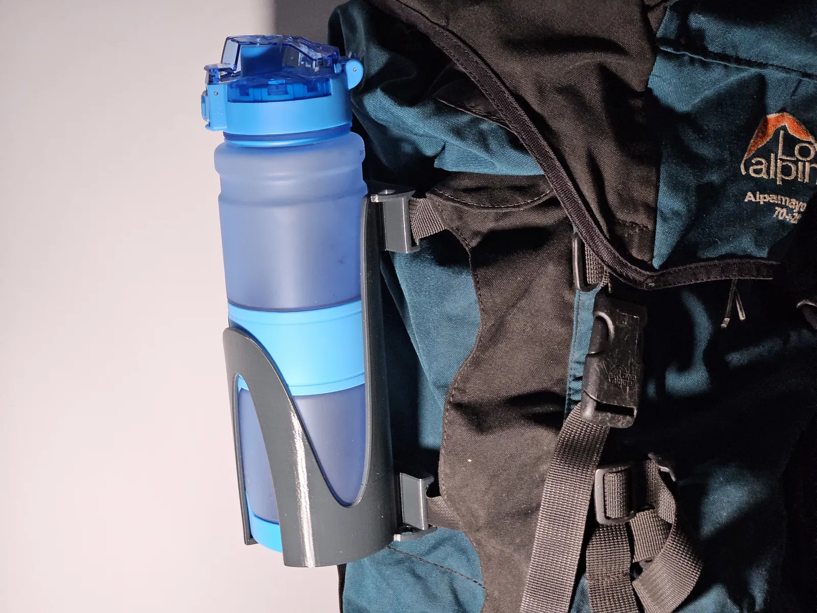 Kệ giữ bình nước cho balo, dùng được cho bình 1 lít / 35 oz. Đường kính: 80 mm. Thông số in đề xuất: PETG, độ phân giải 0.2 mm, 3 lớp tường, hỗ trợ Organic.